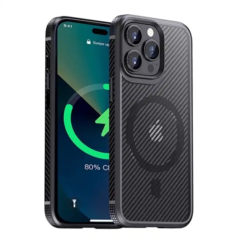 قاب آیفون 14 Pro iPaky MGC از ترکیبی از PC و TPU ساخته شده است و قسمت پشتی آن به صورت نیمه شفاف بوده و دارای بافت فیبر کربنی است. برای محافظت از صفحه نمایش و دوربین لبه های قاب و دور اطراف دوربین به پوششی از جنس TPU مجهز شده اند.