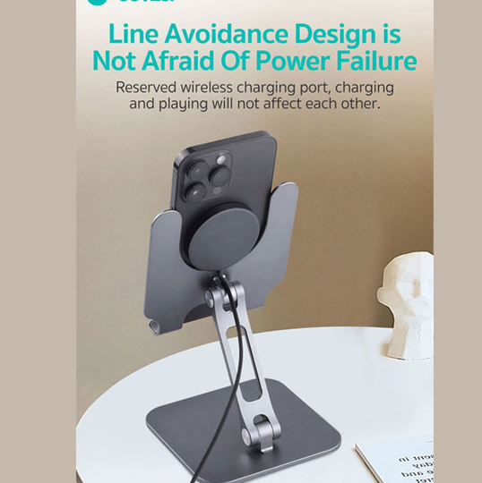 ساخته شده از آلیاژ آلومینیوم دارای قابلیت تنظیم زاویه دید دارای قابلیت تاشو دارای بخشی برای عبور شارژر وایرلس