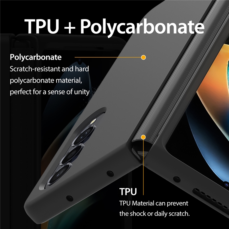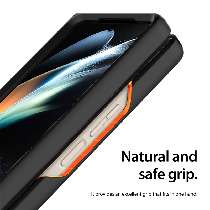 قاب گوشی دار آراری Z Fold 4 به صورتی طراحی شده است که به واسطه فریم پلی کربناتی داخلی خود می‌تواند ضربات ناگهانی وارده به گوشی را جذب کند.