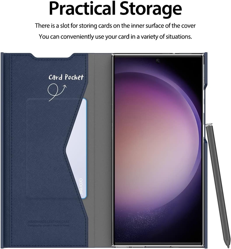 روی درب کیف استند دار آراری Samsung S23 Ultra Araree Bonnet Stand یک جاکارتی تعبیه شده است و می توانید کارت شناسایی یا کارت بانکی خود را در آن قرار دهید.