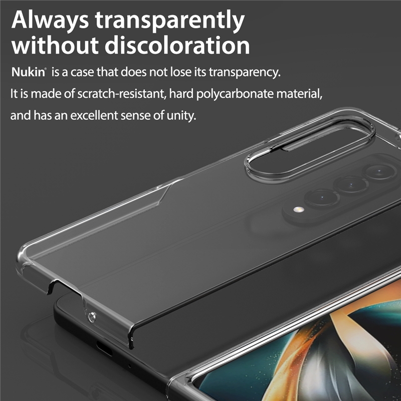 قاب سامسونگ Z Fold4 Araree Nukin Clear از PC ساخته شده است که قسمت پشتی آن شفاف است. برای محافظت از صفحه نمایش و دوربین لبه های قاب و دور اطراف دوربین نیز دارای پوششی از جنس PC مجهز شده اند.