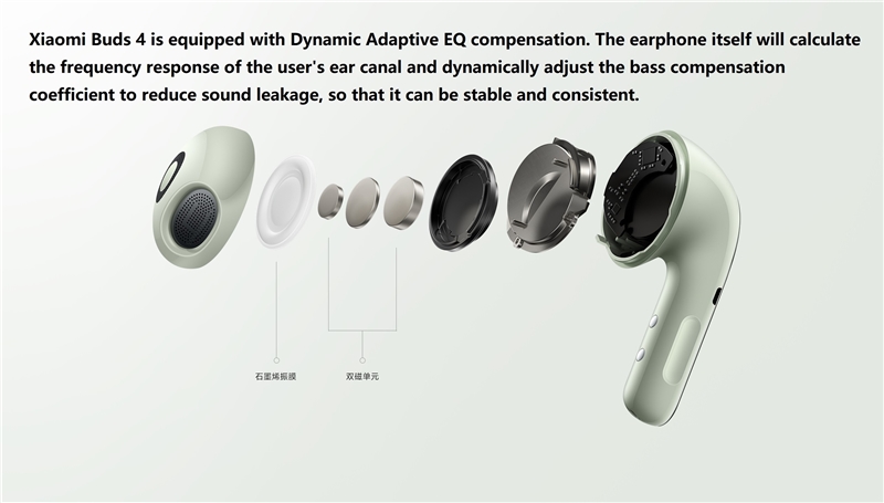 Xiaomi Buds 4 می‌تواند با شناسایی «ساختار کانال گوش شما»، «سبک قرار دادن هندزفری در گوش توسط شما» و «صدای محیط»، و متعادل کردن فشار گوش برای راحتی استفاده و کاهش نویز، عمق و شدت کاهش نویز را در آن واحد تنظیم کند.