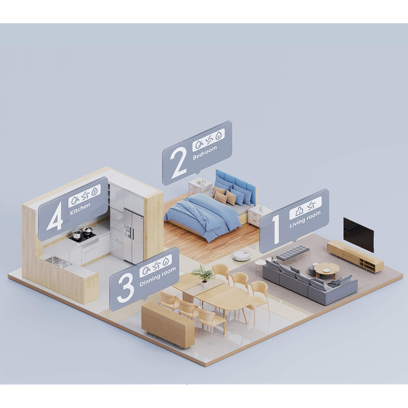 سه سناریو تمیز کردن در برنامه وجود دارد: جاروی معمولی، جارو و تمیز کردن مرطوب و تمیز کردن مرطوب. همچنین این مدل مجهز به یک برس کناری و یک برس توربو چرخان مرکزی است. حجم گردگیری اصلی 0.45 لیتر بوده که برای تمیز کردن حداقل دو اتاق متوسط کاملاً کافی است. جهت تخلیه مخزن، میتوانید آن را به راحتی جدا کرده و تمیز کنید. در این مدل بیرون آوردن مو یا نخهای ضخیم از روی برس توربو و برس کناری بسیار راحت است. جهت تمیز کردن مرطوب بایستی از ظرف مخصوص با مخزن آب 250 میلیلیتری استفاده کنید. همچنین میتوانید در برنامه، درجه خیس شدن پارچه را تنظیم کنید. تأمین آب به صورت الکترونیکی تنظیم میشود که در حین حال با متوقف شدن دستگاه، پاشش آب به صورت خودکار نیز متوقف میشود.
