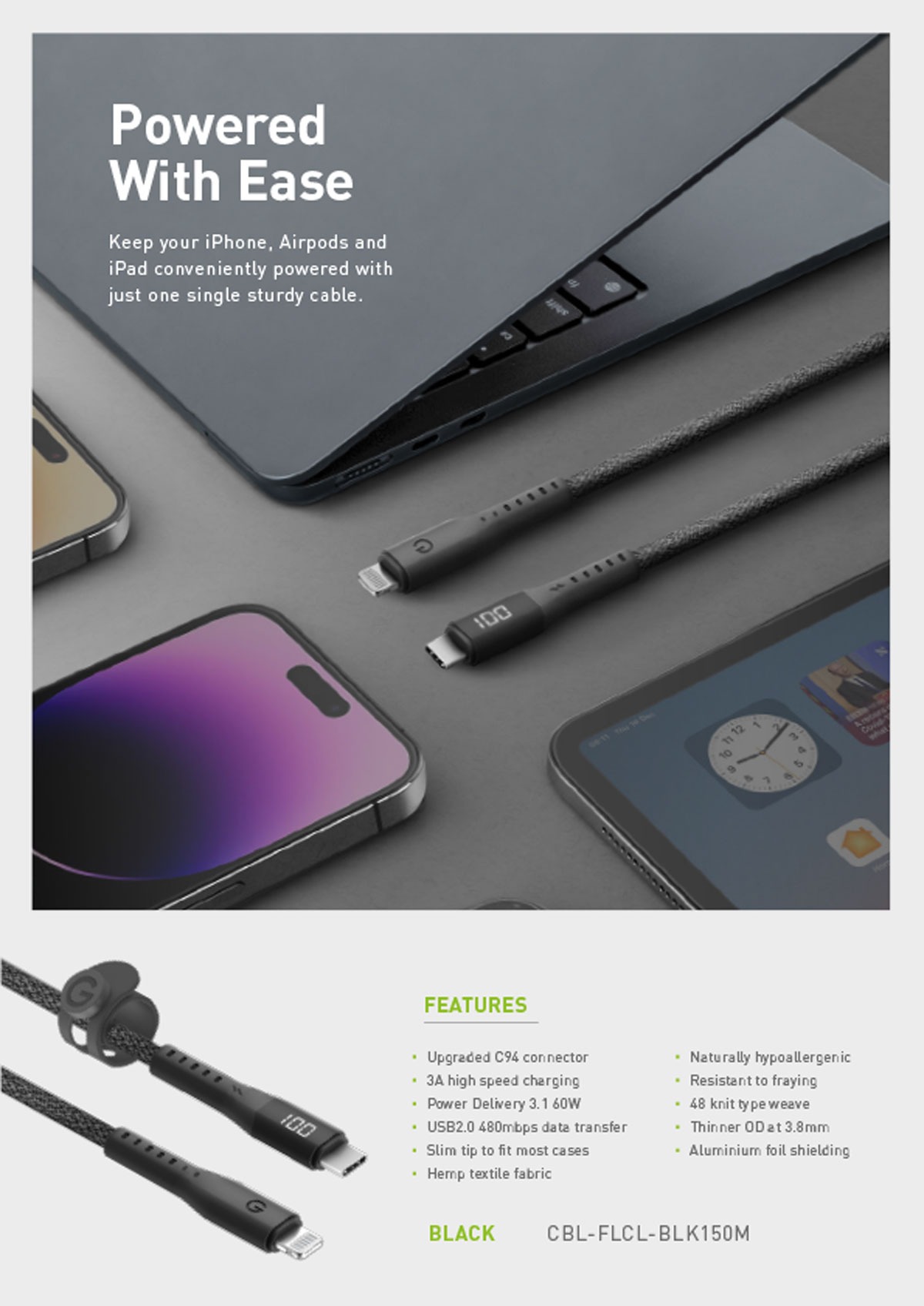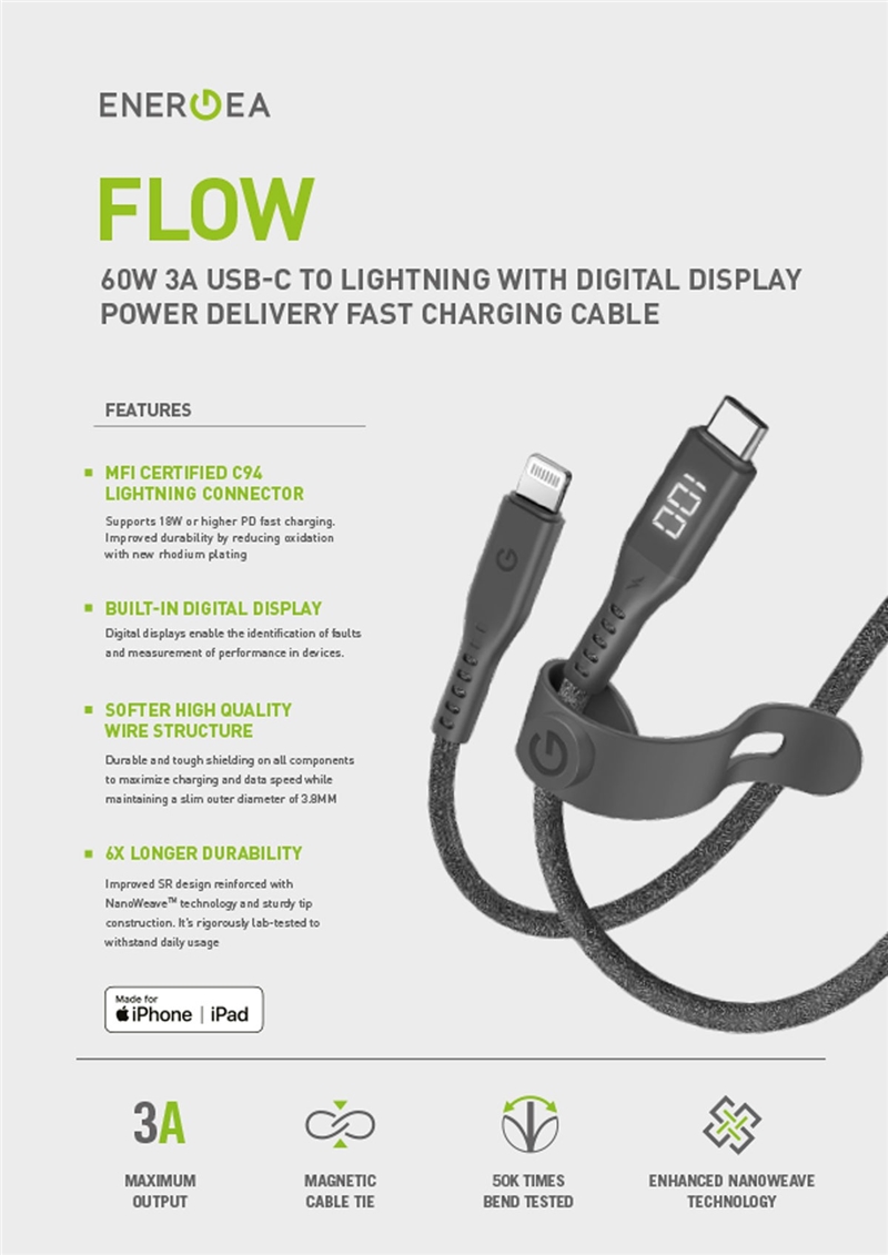 کابل USB-C 60W به لایتنینگ انرژیا مدل FLOW with Display یک بهروزرسانی کامل دیده است با اضافه کردن پارچه تکستایل شده از کنف، که نتیجه یک ترکیب چشمنواز از لطافت و مقاومت بهبود یافته است. علاوه بر این، این کابل دارای سیستم مدیریت کابل MagLink نوآورانه است که به شما این امکان را میدهد که به راحتی سیمهای خود را مرتب کرده و از آنها با استفاده از دستبند کابل و دکمه مغناطیسی داخلی راحتانه بر روی هر سطح فلزی نصب کنید. این محصول نیز تاییدیه MFI از طرف اپل را دریافت کرده است.