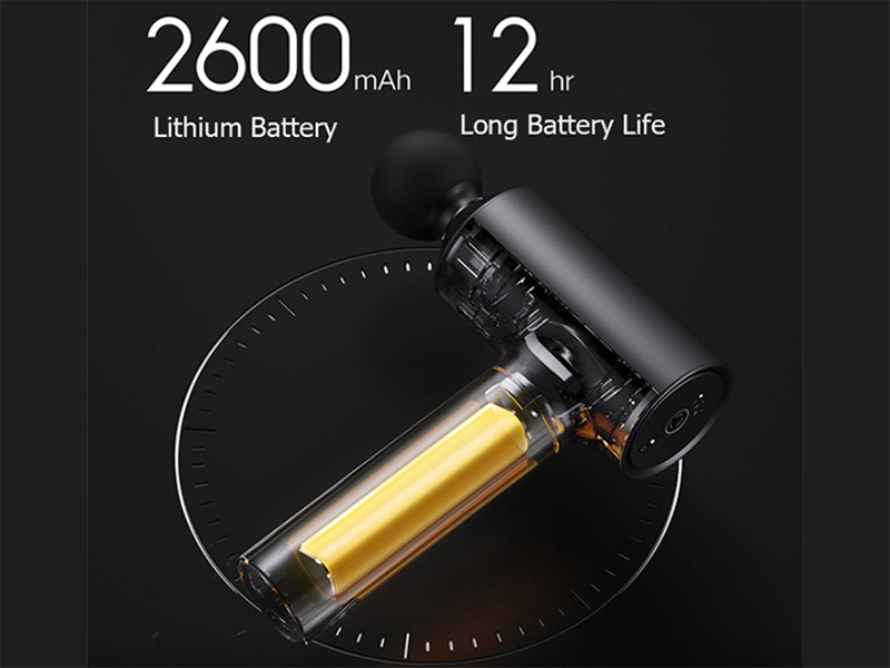 باتری Massage Gun با ظرفیت 2600 میلی آمپر تا 5 ساعت مداوم کار می کند. پورت شارژ نیز از نوع USB-C است و با کابل تایپ سی به راحتی میتوان آن را شارژ کرد.