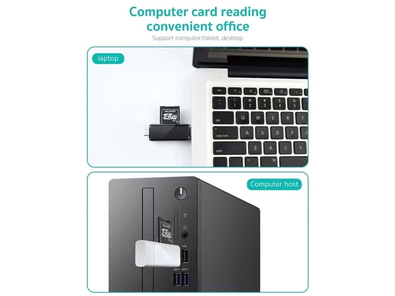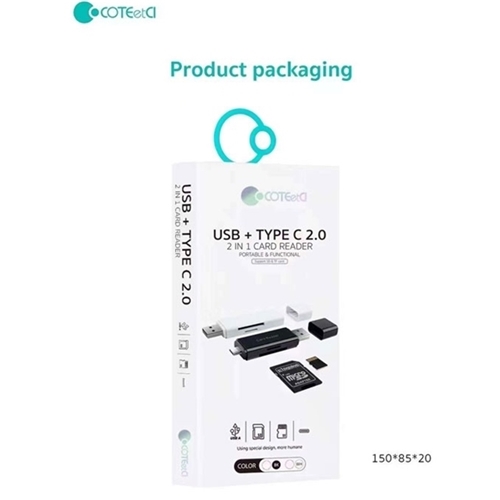 رم ریدر 83006 Coteetci دارای دو کانکتور Type-c و Usb میباشد. به کمک کانکتور تایپ سی این رم ریدر به راحتی میتوانید اطلاعات را از گوشی خود به یک رم و یا از یک رم به یک گوشی منتقل کنید. تنها کافی است که کانکتور Type-c را به گوشی خود وصل کرده و در درگاه کارتخوان نیز رم از نوع SD یا Micro SD قرار دهید. البته برای این کار باید گوشی شما از قابلیت OTG پشتیبانی کند.