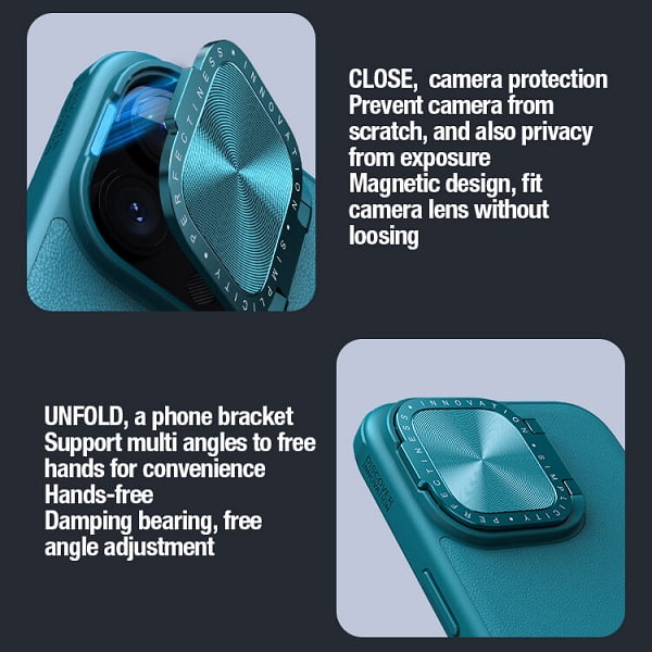 دوست دارید بهصورت همزمان هم از بدنه گوشی و هم از لنز دوربین آن محافظت کنید؟ خرید قاب چرمی نیلکین گوشی اپل آیفون iPhone 15 Pro Max گزینهی امن و مناسب برای اسمارت فون شما خواهد بود. اگر بخواهید یک گلس برای لنز دوربین گوشی موبایلتان بخرید، امنیت آن را تضمین کردهاید. اما در نظر داشته باشید نصب گلس روی لنز دوربین از هر نوعی که باشد تا حدی کیفیت دوربین را کاهش خواهد داد. این کاور محافظ نه تنها پشت گوشی و اطراف آن را پوشش میدهد، بلکه مجهز به یک کاوری است که از لنز دوربین محافظت میکند. در مواقع لازم نیز میتوانید بهراحتی آن را باز کرده و به عنوان استند از آن استفاده کنید.