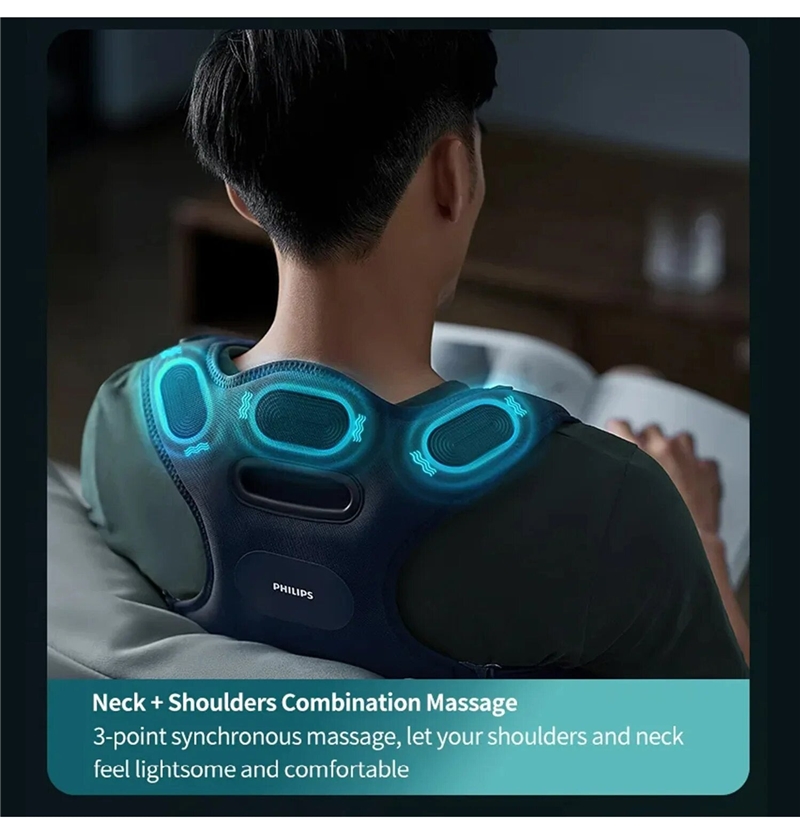 ماساژور شانه Philips به صورت یک پوشش تقریباً جلیقه مانند ساخته شده که قیمتهای پایین گردن و شانه شما را میپوشاند. این ماساژور شرکت فیلیپس به صورت سه ناحیه را پوشش میدهد و بدین ترتیب شانه و گردن شما را با ماساژ ارتعاشی ماساژ می دهد. همچنین با تولید گرم به شل شدن عضلات گردن کمک می کند. ابعاد این ماساژور برابر 454x367x20 میلیمتر است و وزنی برابر 310 گرم دارد. پوشش داخلی این ماساژوراز جنس پارچه آنتی باکتریال، قابل تنفس و ضد تعریق است. بدنه خارجی نیز ا ز پوشش ضد آب استفاده میکند تا به راحتی کثیف نشود. در ساخت این محصول همچنین از مواد با قابلیت کشسانی بالا استفاده شده است. همچنین بند این محصول بین دو حالت 25 سانتی و 35 سانتی قابل تنظیم بوده که کمک میکند بسته به وزن خود بتوانید از هر کدام که خواستید استفاده کنید. بنا به گفته شرکت سازنده اگر وزن کمتر 55 کیلو دارید بهتر است از بند 25 سانتی و اگر وزن بیشتر از 55 کیلو دارید بهتر است از بند 35 سانتی اضافه کنید.