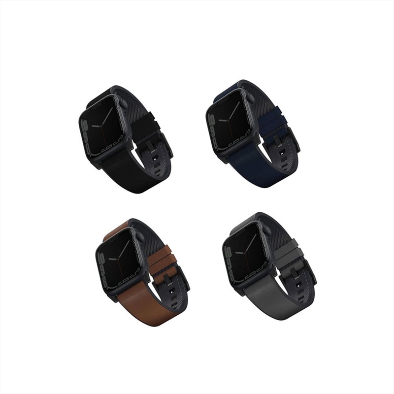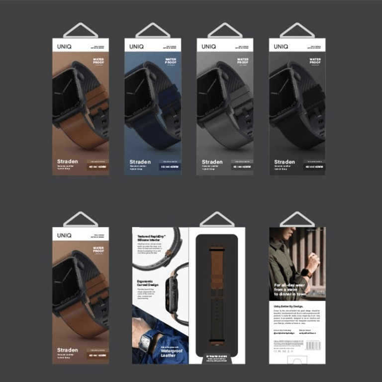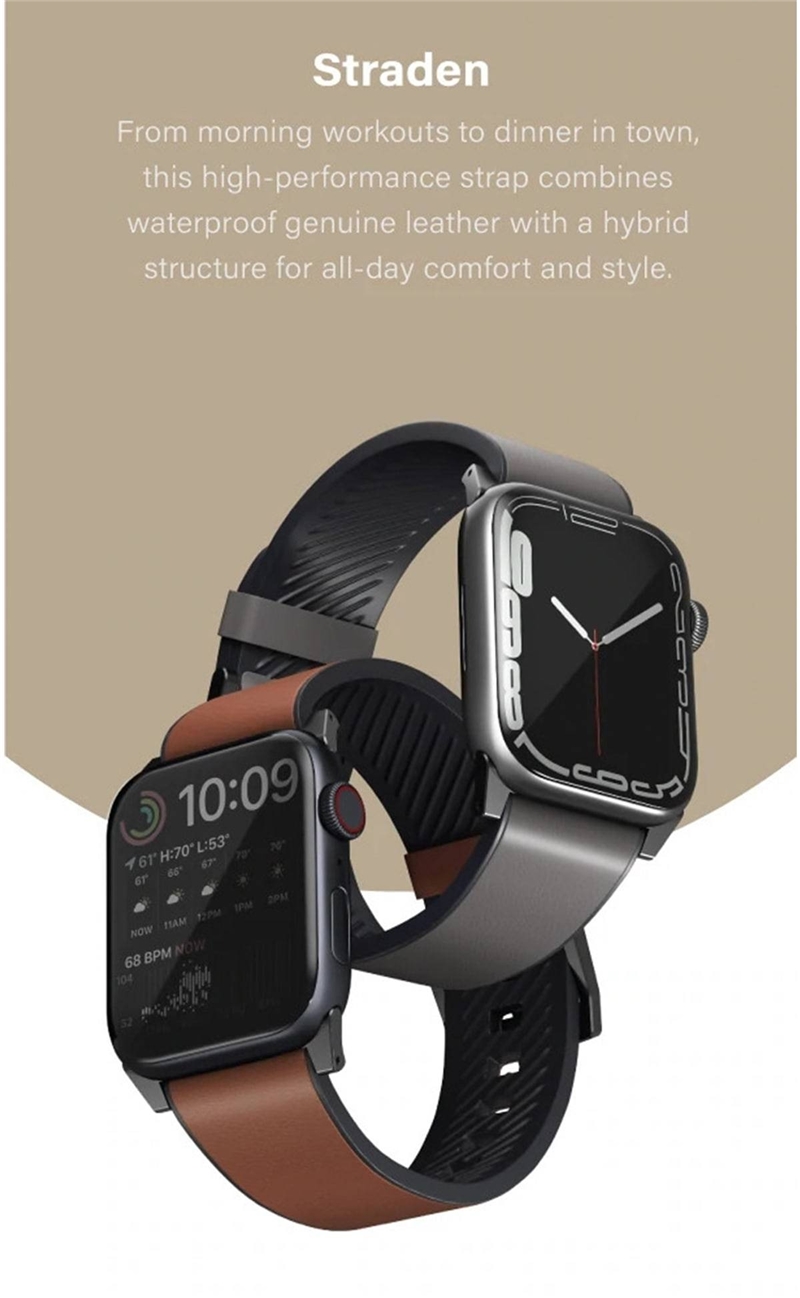 بند اپل واچ یونیک سری Straden از چرم مرغوب تولید شده است. طراحی این سری بندها Hybrid است تا استفاده مداوم از آن راحت باشد. بندهای سری استرادن در چهار رنگ مشکی، خاکستری، قهوه ای و آبی و برای سه سایز اپل واچ ۴۲، ۴۴ و ۴۵ میلی متری عرضه شده اند.