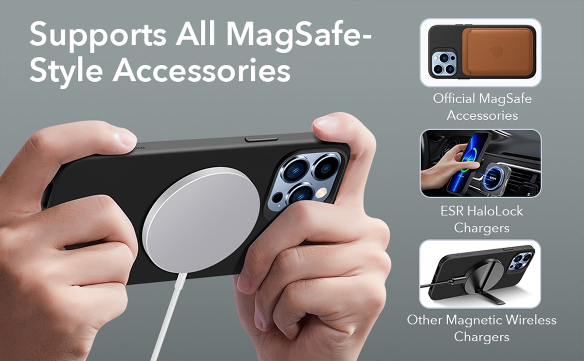 قاب سیلیکونی آیفون 13 پرو مکس مدل Cloud Soft برند ESR قاب ESR Cloud Soft آیفون 13 پرو مکس از متریال سیلیکونی در چند رنگ طراحی و عرضه شده است. این قاب قابلیت مگ سیف دارد و با شارژر وایرلس مگ سیف اپل و سایر لوازم جانبی هایی که دارای آهنربا می باشند، سازگار است. همچنین قاب Cloud Soft دارای استاندارهای نظامی می باشد و کاملا مقاوم به خصوص در گوشه ها برای محافظت از آیفون 13 پرو مکس است. طراحی قاب Cloud Soft قاب Cloud Soft برند ESR مانند سایر قاب های محافظ سیلیکونی، طراحی ساده ای دارد. انتخاب نام Cloud Soft برای این قاب بیانگر لطافت، نرمی و حس خوب لمس قاب می باشد. برش ها در این قاب کاملا دقیق هستند تا هیچ خللی برای استفاده از گوشی ایجاد نشود. متریال سیلیکون استفاده شده در ساخت قاب بسیار با کیفیت است تا بدنه قاب در مقابل جذب اثر انگشت و ایجاد خط و خش تا حدود زیادی مقاوم باشد. دارای گواهینامه تست های سقوط و استانداردهای نظامی قاب Cloud Soft دارای گواهینامه تست های سقوط و استانداردهای نظامی می باشد که بیانگر مقاومت این قاب در برابر سقوط و ضربه است. این قاب به صورت کلی از سه لایه میکروفیبر، پلی کربنات و سیلیکون ضد شوک تشکیل شده اسنت که این لایه در کنار یکدیگر مقاومت قاب را بالا برده اند. محافظت از پنل لنزهای دوربین و لبه های صفحه نمایش لبه های قاب ESR Cloud Soft آیفون 13 پرو مکس کمی برجسته طراحی شده اند تا از لبه های صفحه نمایش گوشی محاقظت کنند. در قسمت پنل لنزهای دوربین نیز قاب کمی برجسته تر است تا از این ناحیه حساس نیز در برابر خط و خش و آسیب های مشابه هم محافظت شود. سازگار با شارژر وایرلس مگ سیف اپل قاب Cloud Soft دارای 36 مگنت داخلی می باشد که آن را با شارژر وایرلس مگ سیف اپل و انواع لوازم جانبی های مغناطیسی سازگار می کند. بنابراین نیازی به استفاده از مگنت های متفرقه برای گوشی نیست. قاب ESR مدل Cloud Soft مناسب برای Apple iPhone 13 Pro Max تشکیل شده از سه لایه مقاوم داخلی میکروفیبر، پلی کربنات و سیلیکون محافظت از لنزهای دوربین در برابر خط و خش و تماس با سطوح مختلف دارای گواهینامه تست های سقوط و استانداردهای نظامی محافظت از لبه های صفحه نمایش سازگار با انواع شارژرهای وایرلس سازگار با مگ سیف اپل