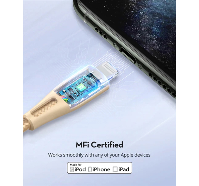 جنس روکش سیم از نایلون بافته شده تا 100 هزار مرتبه تحمل خمش طول کابل 2 متر دارای تاییدیه MFI اپل پشتیبانی از فستشارژ PD پشتیبانی از انتقال اطلاعات با سرعت بالا