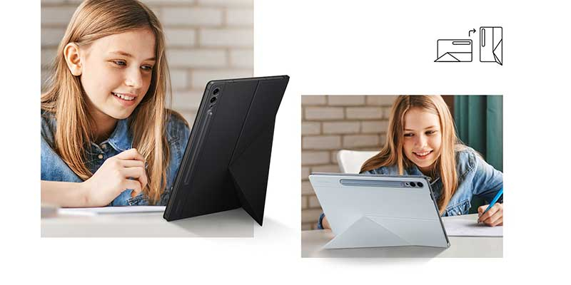 دختر جوانی با استفاده از Galaxy Tab S9+ با جلد کتاب هوشمند، به صورت عمودی قرار گرفته و با پایه تکیه داده شده است. در کنار آن، او در حال استفاده از دستگاه به صورت افقی با پایه در پشت دیده می شود. دختر جوانی با استفاده از Galaxy Tab S9+ با جلد کتاب هوشمند، به صورت عمودی قرار گرفته و با پایه تکیه داده شده است. در کنار آن، او در حال استفاده از دستگاه به صورت افقی با پایه در پشت دیده می شود.