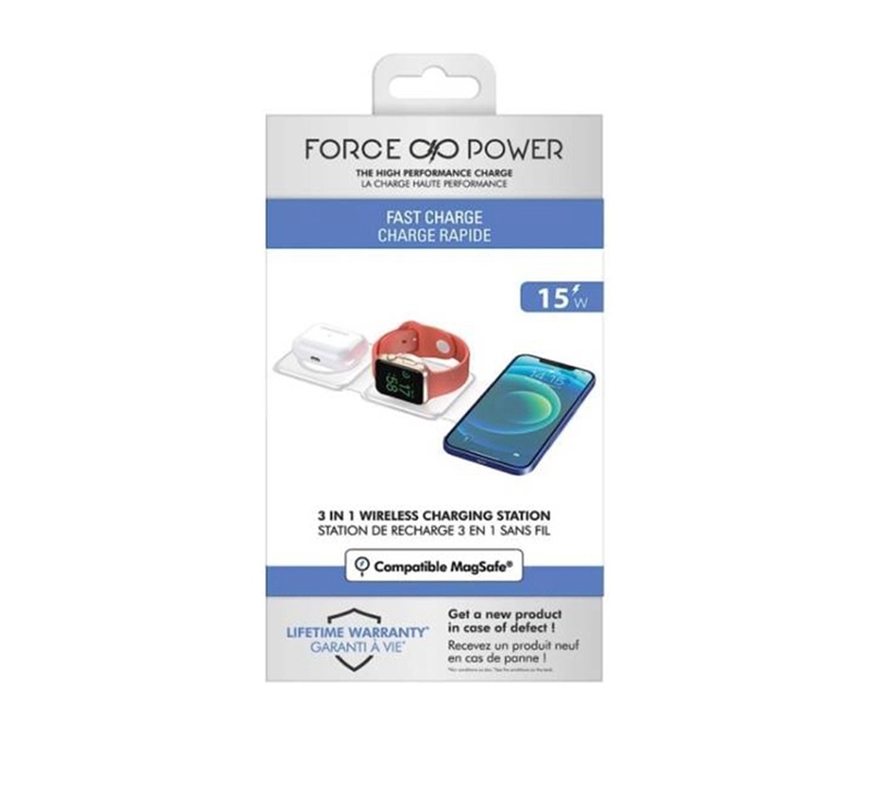 ایستگاه شارژ 3 در 1 با حداکثر توان 15 وات از Force Power برای شارژ بی سیم همه دستگاه های سازگار شما. ایستگاه شارژ سازگار MagSafe: آیفون 12 و جدیدتر شما را سریع و دقیق شارژ