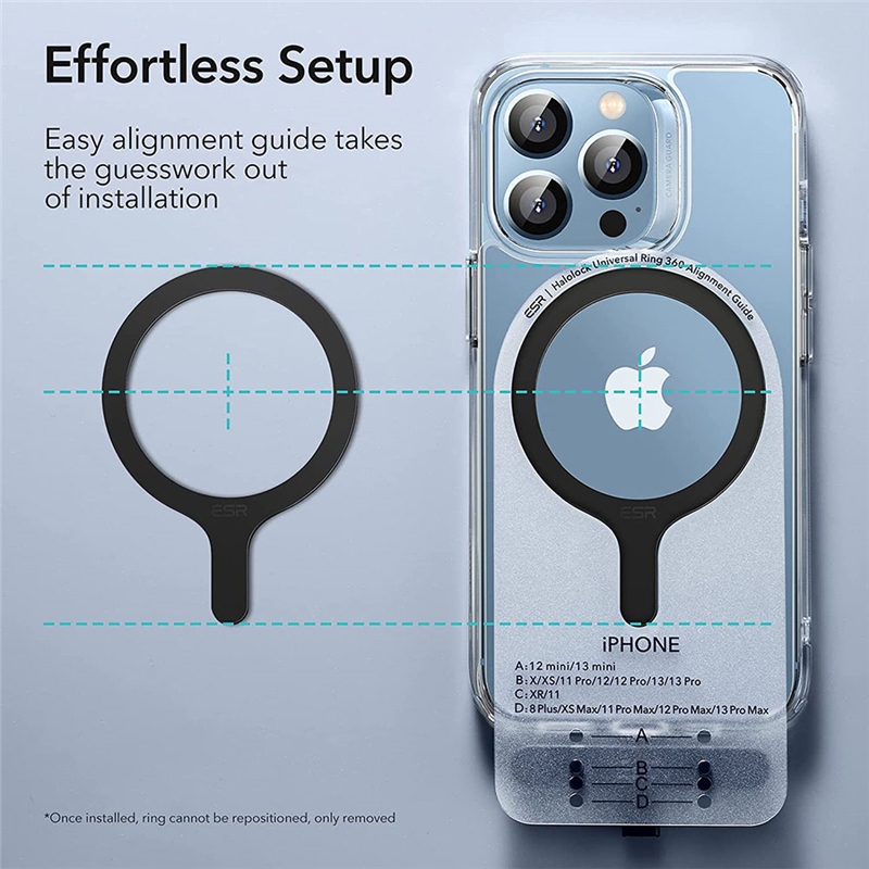 شما می توانید رینگ مگسیف ESR HaloLock Universal MagSafe Ring را یکبار به یک قاب متصل کنید و در صورت عدم تمایل آن را بردارید ، اما پس از آن دیگر قابلیت اتصال مجدد را نخواهد داشت . اما نگران نباشید در این بسته ESR دو عدد حلفه مگنتی برای شما قرار داده است که با استفاده از ابزرا نصب آسان می توانید به راحتی از آن استفاده نمایید .