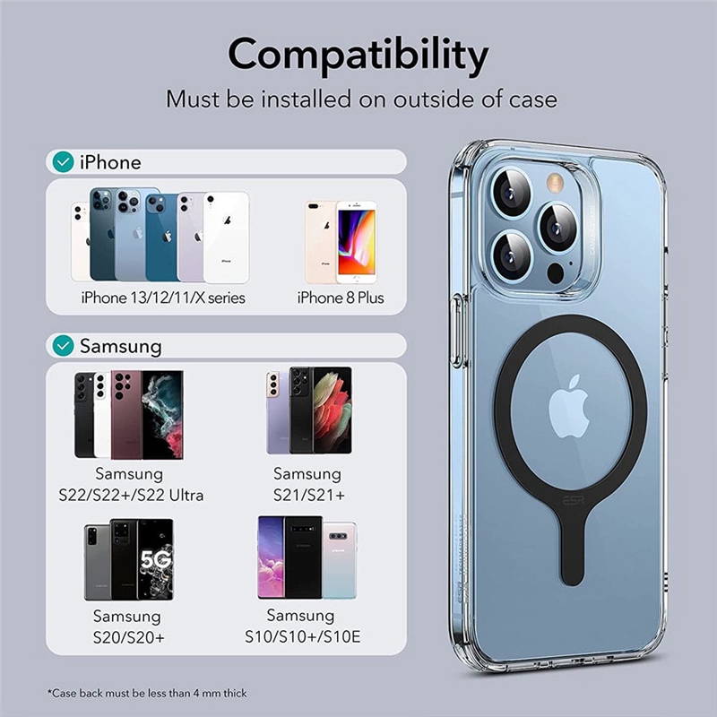 ESR HaloLock Universal MagSafe Ring با ابزار نصب آسان قابلیت اتصال به تمامی قاب های PC و TPU ساده را دارد . به این ترتیب می بینیم که برای یک اتصال محکم مناسب استفاده با قاب های چرمی، سیلیکونی و شیشه ای نیست. توجه داشته باشید که این حلقه به تنهایی قابلیت مگنتی ندارد ، زمانی که بر روی گوشی وصل می شود ، اکسسوری های دارای مگنت به آن متصل خواهد شد .