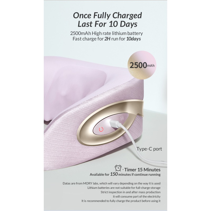 شما میتوانید در هر کجا که هستید از ماساژور گردن شیائومی Mory N03 استفاده کنید. شرکت شیائومی برای ماساژور گردن شیائومی Mory N03 یک باتری داخلی 2500 میلی آمپر ساعتی در نظر گرفته که برای پر شدن شارژ آن به حدود 2 ساعت شارژ نیاز دارد. برای شارژ کردن این ماساژور می توانید از درگاه تایپ سی تعبیه شده روی بدنه استفاده کنید.