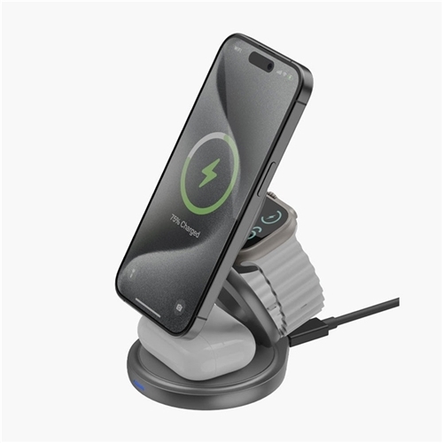 سایر ویژگی هاپشتیبانی از شارژ بی‌سیم سریع تا 15W تجربه شارژ بی‌سیم بدون درز با تکنولوژی MagSafe همگام‌سازی خودکار مغناطیسی برای شارژ بی‌سیم امن سازگار با کیس‌های رسمی MagSafe امکان تنظیم زاویه دید 360 درجه با چرخش پایه چند زاویه کاربردی ساختار با کیفیت با استند قابل تاشو شارژر داخلی واچ اپل طراحی برای شارژ آیفون، واچ و AirPods در یک مکان امکان شارژ در حالت عمودی یا افقی کیف حمل محافظ همراه