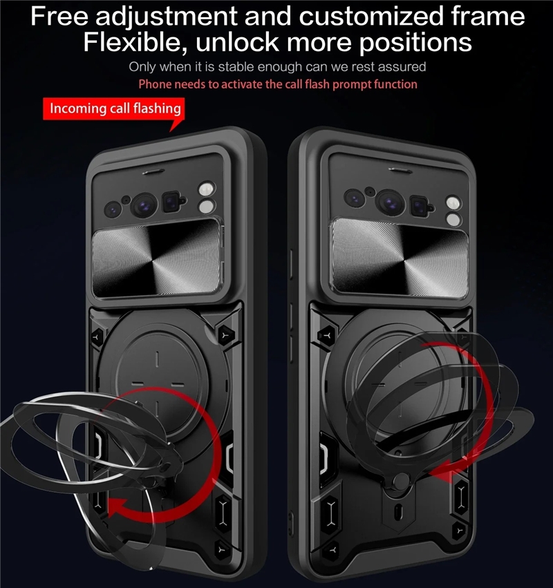 لنز دوربین‌ها معمولا در معرض خش برداشتن و آسیب دیدن هستند. همان طور که گفته شد این قاب علاوه بر ضد ضربه ساختن گوشی دارای بخشی کشویی برای محافظت کامل از دوربین گوشی است. در قسمت پشت قاب ضد ضربه گوگل Google Pixel 8 Pro Magnetic Support Case یک بخش متحرک وجود دارد که مانند یک درپوش کشویی روی دوربین گوشی را می پوشاند. در صورت دلخواه می توانید این درپوش را کنار زده و از دوربین خود استفاده کنید.