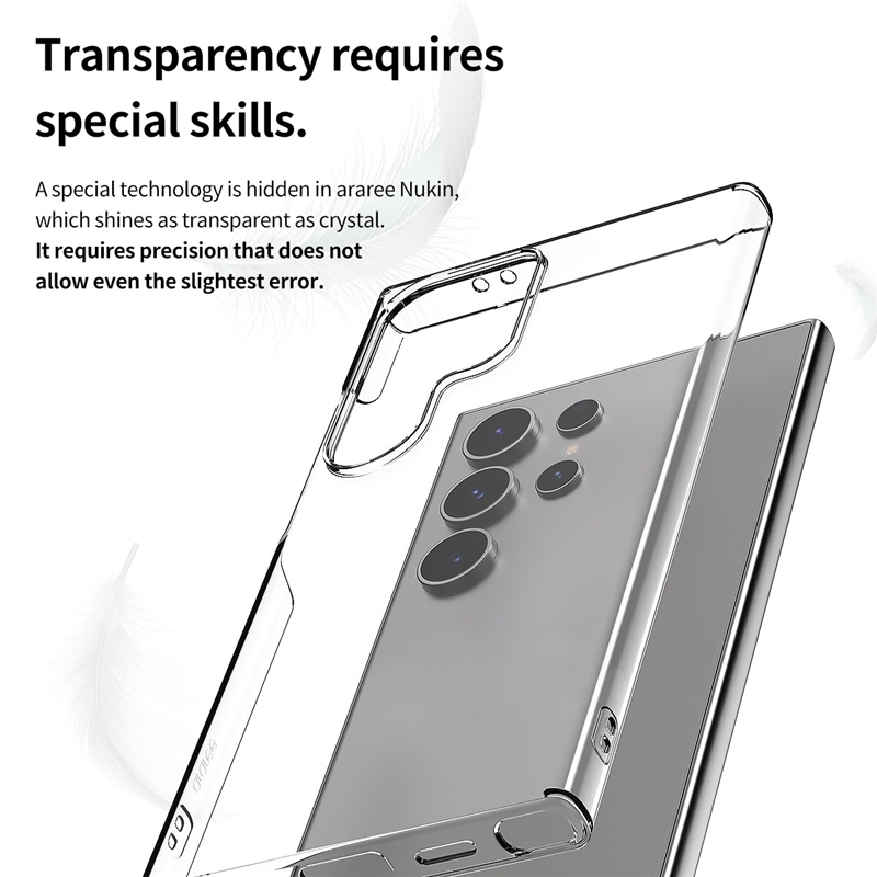 قاب سامسونگ S24 Ultra Araree Nukin Clear از PC ساخته شده است که قسمت پشتی آن شفاف است. برای محافظت از صفحه نمایش و دوربین لبه ‌های قاب و دور اطراف دوربین نیز دارای پوششی از جنس PC مجهز شده اند.