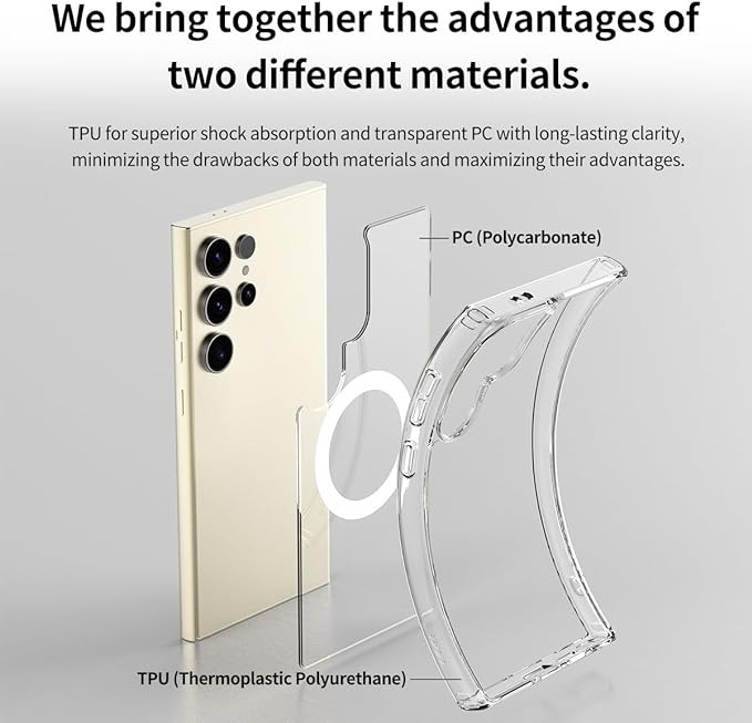 قاب مگنتی سامسونگ S24 Plus Araree Duple M از PC ساخته شده است که قسمت پشتی آن شفاف است. برای محافظت از صفحه نمایش و دوربین لبه ‌های قاب و دور اطراف دوربین نیز دارای پوششی از جنس PC مجهز شده اند.
