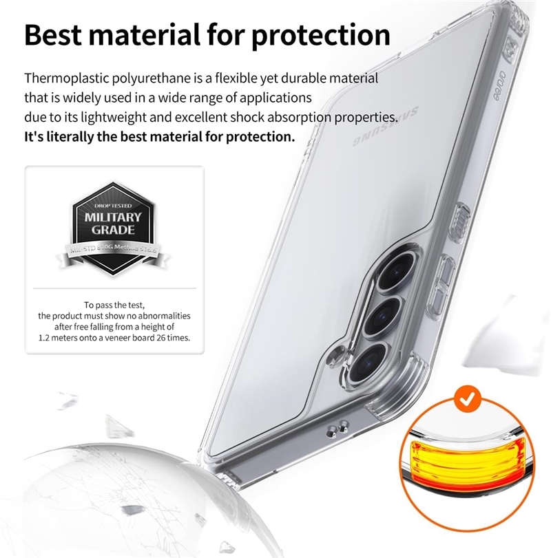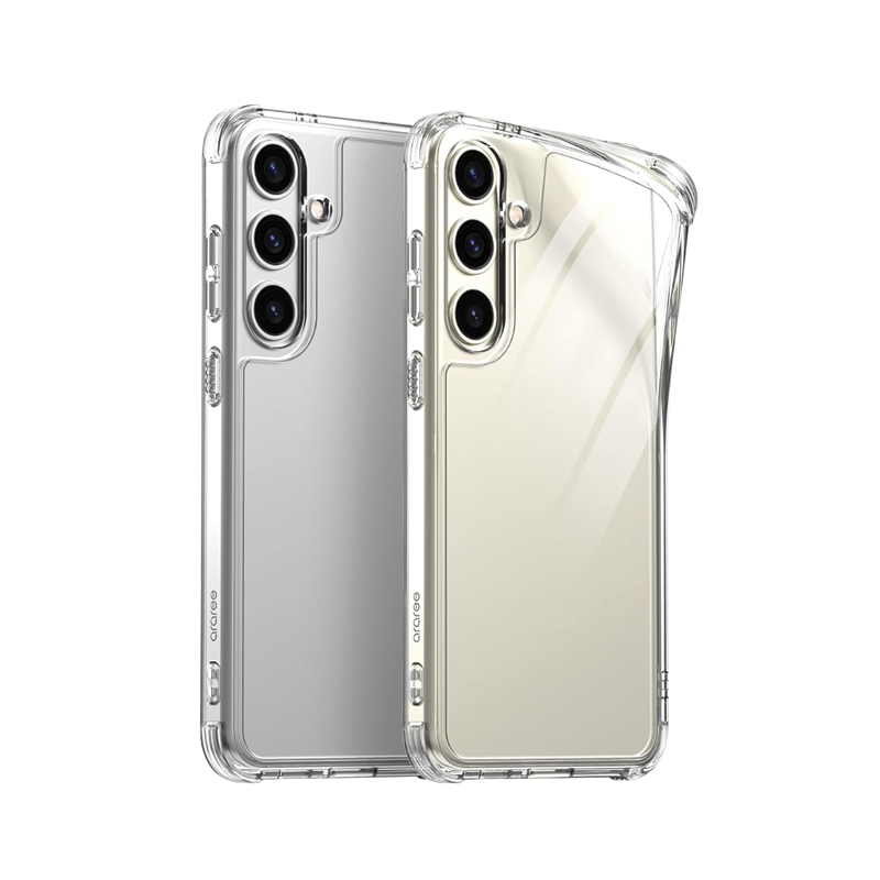 قاب سامسونگ S24 Araree Flexield ازTPU ساخته شده است که قسمت پشتی آن شفاف است. برای محافظت از صفحه نمایش و دوربین لبه های قاب و دور اطراف دوربین نیز دارای پوششی از جنس TPU مجهز شده اند.