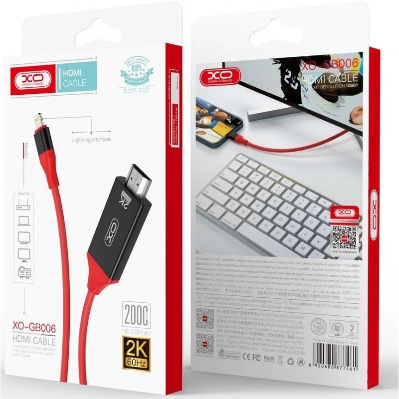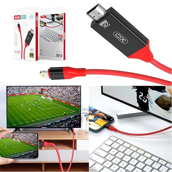 کابل HDMI به لایتنینگ ایکس او GB006 از یک کانکتور لایتنینگ (آیفونی) و یک کانکتور HDMI تشکیل شده که شما می توانید تصاویر را از گوشی یا آیپد به مانیتور و یا تلوزیون های بزرگتر منتقل کنید. البته برای انتقال تصویر از موبایلتان باید دستگاه شما از این قابلیت پشتیبانی کند.
