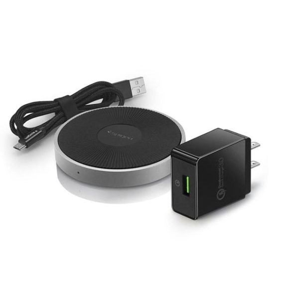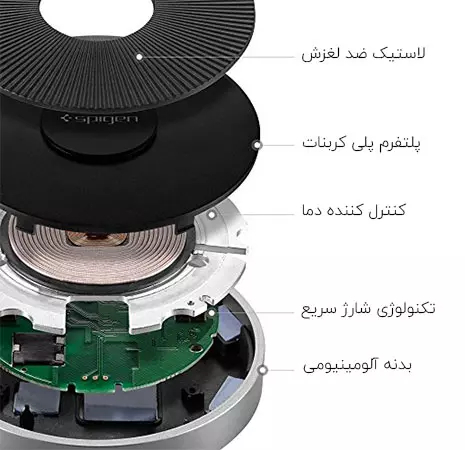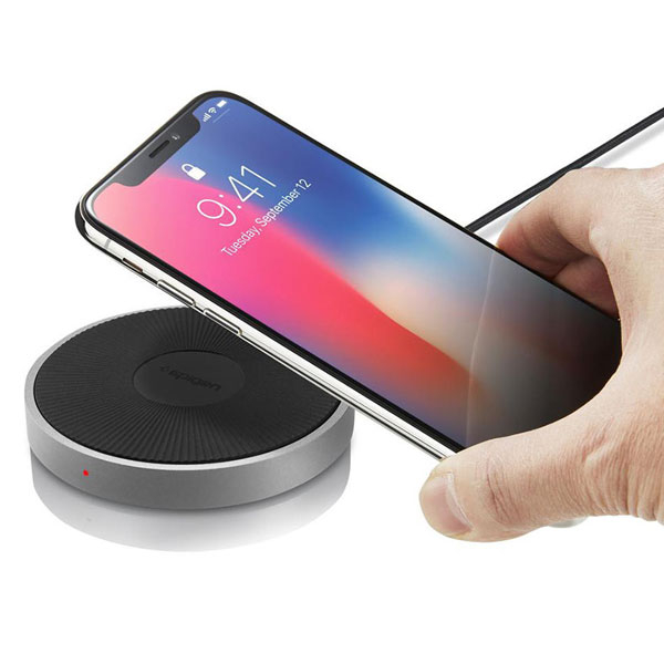 شارژر وایرلس اسپیگن بدنه ای آلومینیومی دارد که مقاوم و بادوام است. سطحی که گوشی بر روی آن قرار می گیرد نیز ضد لغزش است تا گوشی کاملا ایمن و ثابت بر روی این سطح قرار بگیرد. در قسمت جلویی شارژر یک LED کوچک، زمانی که شارژر در حال استفاده است، به رنگ سبز و در حالتی که گوشی بر روی شارژر قرار ندارد به رنگ قرمز روشن می شود.