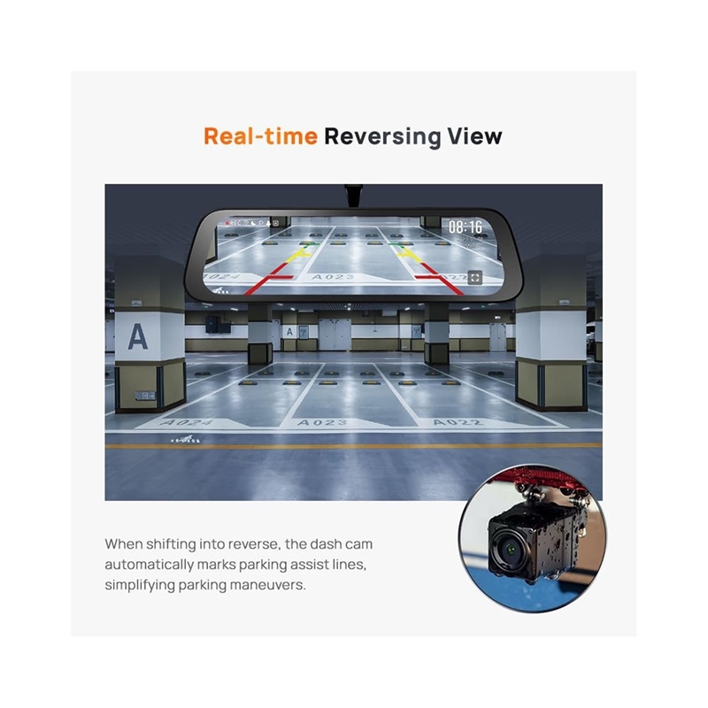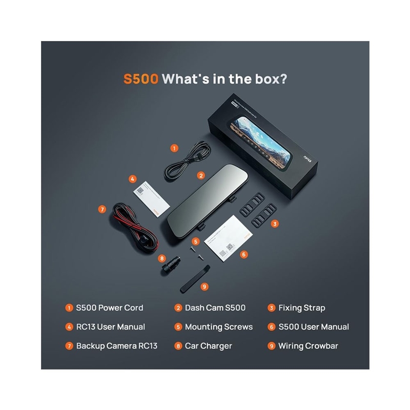 اولین نکتهای که در مورد دوربین خودرو شیائومی 70mai S500 به چشم میآید، این است که از دو دوربین تشکیل شده است: یک دوربین که به همراه مانیتور پشت جلو آینه نصب میشود. یک دوربین RC13 نیز مخصوص بخش عقب است که دارای راهنمای پارک کردن است. ابعاد مانیتور آینه هوشمند خودرو Xiaomi 70mai S500 Setنیز 9.3 اینچ است. منبع تغذیه دوربین جلو از نوع Super Capacitor بوده که از سازگاری بسیار بالا با شرایط آب و هوایی مناسب و همچنین طول عمر طولانی برخوردار است. برای استفاده، میبایست این دوربین را به شارژر فندکی خودرو وصل کنید.