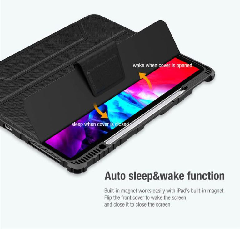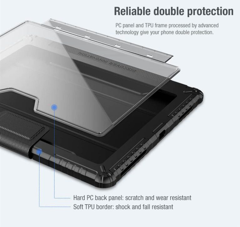 طراح بزرگی که آیپد ها دارند باعث شده است که همیشه احتمال آسیب به آن‌ها وجود داشته باشد.بنابراین بهتر است برای مراقبت از آیپد خود یک کیف زیبا تهیه کنید.با خرید کیف کلاسوری نیلکین مدل Camshield Bumper یک کیف شیک برای آیپد خود خواهید داشت.این کاور بسیار باکیفیت است و از مواد اولیه‌ی درجه یک ساخته شده است.طراحی زیبایی که این کاور دارد چشم‌ها را به خود خیره می‌کند.از جنس TPU، چرم PU و پلاستیک سخت ساخته شده است و امنیت بالایی را به آیپد شما اضافه می‌کند.برای مقاومت بیشتر کیف کلاسوری نیلکین مدل Camshield Bumper از دولایه محافظتی استفاده شده است.قسمت شفاف پشتی از جنس PC محکم و ضد خش است.برای لبه‌های قاب از TPU منعطف استفاده شده تا در برابر شوک و ضربه مقاوم باشد.احتمالا برای شما هم اتفاق افتاده است که به طور ناگهانی شاهد سقوط آیپد یا گوشی خود باشید.اگر دقت کرده باشید آسیب بیشتر از همه گوشه‌ها را تهدید می‌کند.برای حل این مشکل به هر گوشه قاب یک بامپر اضافه شده. پس باوجود این قاب اگر آیپد از دستتان بیافتد آسیبی نمی‌بیند.داخل کیف کلاسوری نیلکین مدل Camshield Bumper آهنرباهایی تعبیه شده که با آهنرباهای آیپد به‌خوبی کار می‌کنند.با برداشتن کاور روی صفحه،نمایشگر روشن می‌شود و با بستنش نمایشگر خاموش می‌شود.با اینکه اکثر کیف‌ها نسبت به قاب ضخامت بیشتری دارند اما ضخامت این کیف به گونه‌ای است که به هیچ وجه شکل و فرم آیپد شما را به هم نمی‌ریزد و همچنان خوش‌استایل باقی می‌ماند.کیف کلاسوری نیلکین مدل Camshield Bumper یک استند هم است! اگر زیاد با تبلت کار می‌کنید برای راحتی لازم است بتوانید آن را در زوایای مختلف قرار دهید. برای این کار به یک استند نیاز دارید. به‌کمک این بامپر می‌توانید آیپدتان را در حالت‌های عمودی یا افقی در هر زاویه‌ای که می‌خواهید تنظیم کنید.نیلکین فکری برای قلم هم کرده. اگر جایی می‌روید و فقط می‌خواهید آیپدتان را با خود ببرید لازم نیست نگران قلم باشید. کنار آیپد جایی برای قلم هم در نظر گرفته شده است. برش‌های این کیف کاملا دقیق‌اند.جای تمام کلیدهای فیزیکی،دوربین،بلندگو و دیگر چیزها بادقت در نظر گرفته شده. بنابراین در استفاده از آن به مشکل برنمی‌خورید.این کاور مانع از ایجاد خط و خراش بر روی دوربین آیپد شما می‌شود.