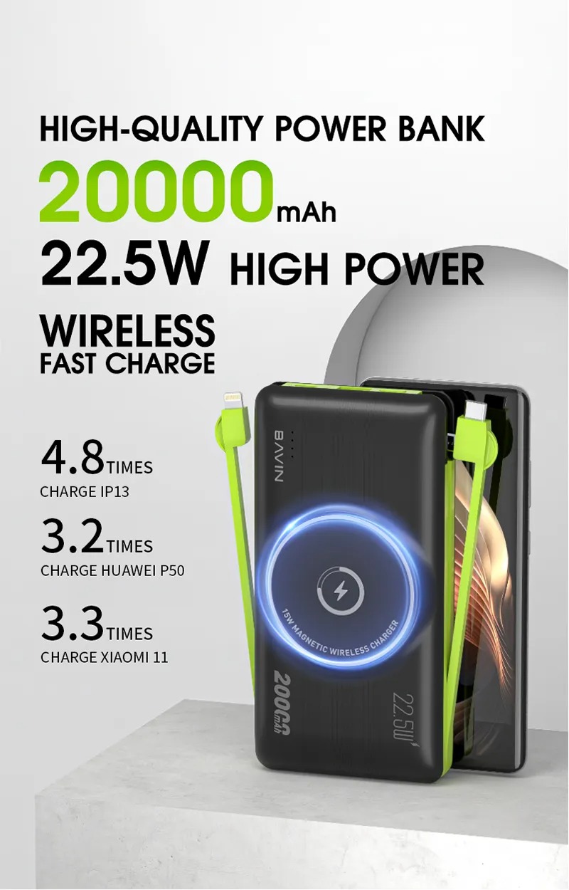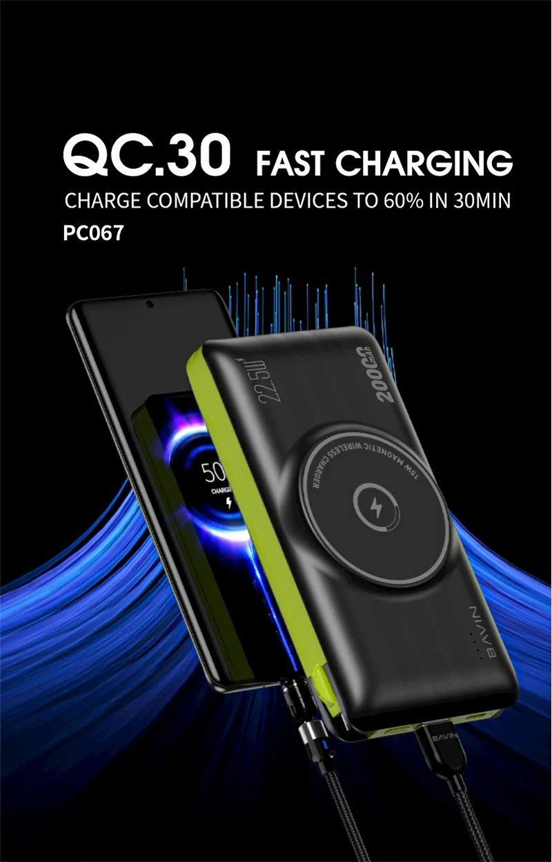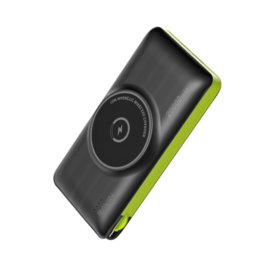 پاور بانگ 20 هزار مگنتی باوین Bavin PC067 15W Magnetic Wireless QC3.0 & PD 22.5W With Cable Powerbank همراه با کابل متصل تایپ سی، لایتنینگ، میکرو توان 22.5 وات