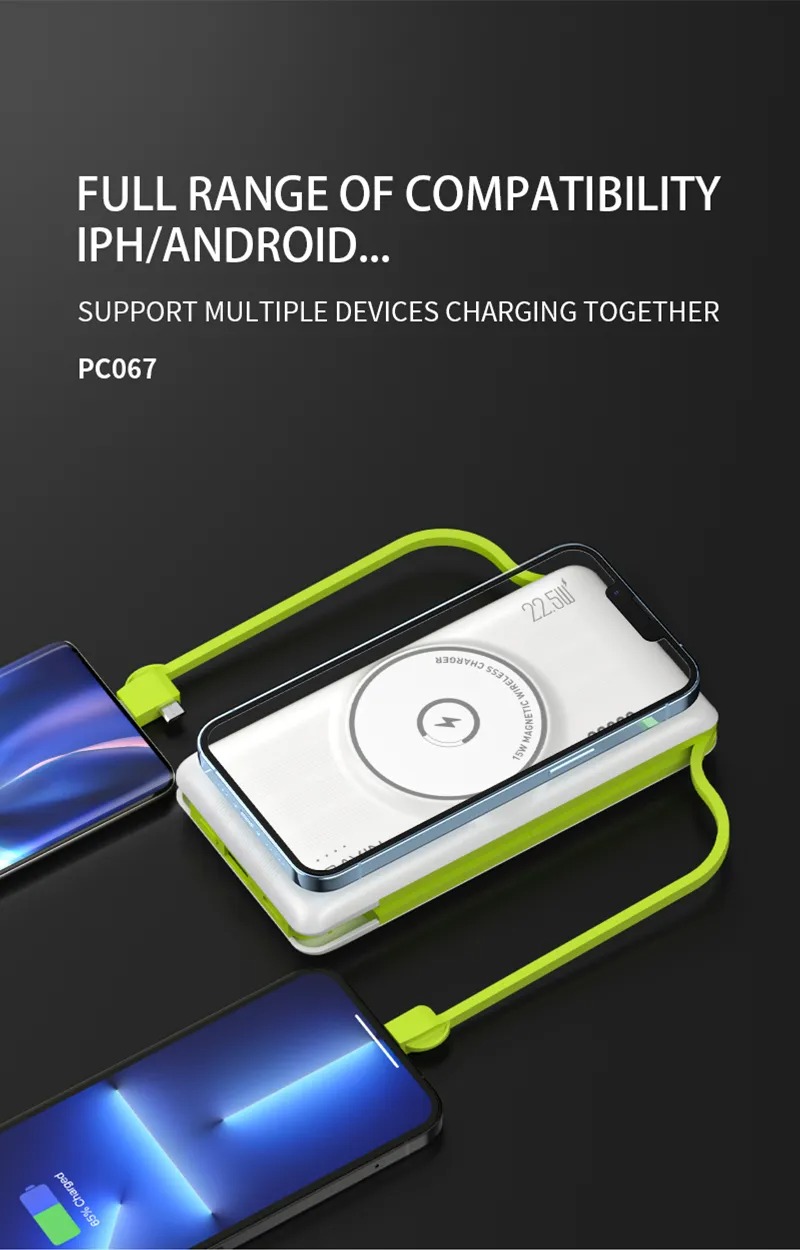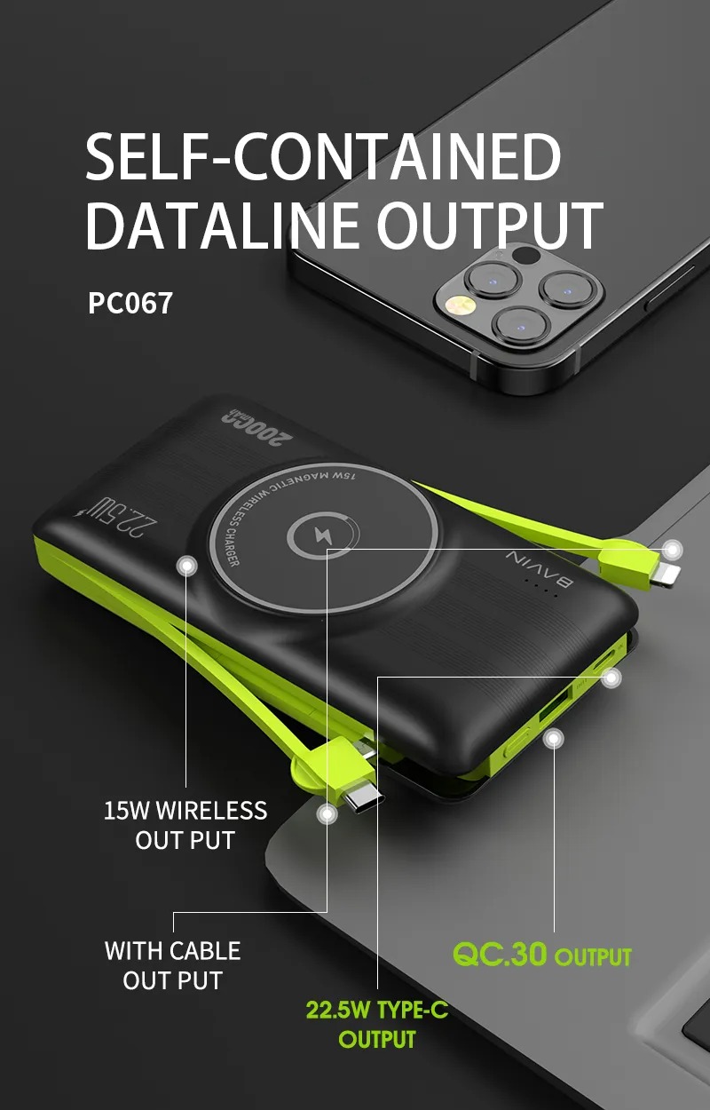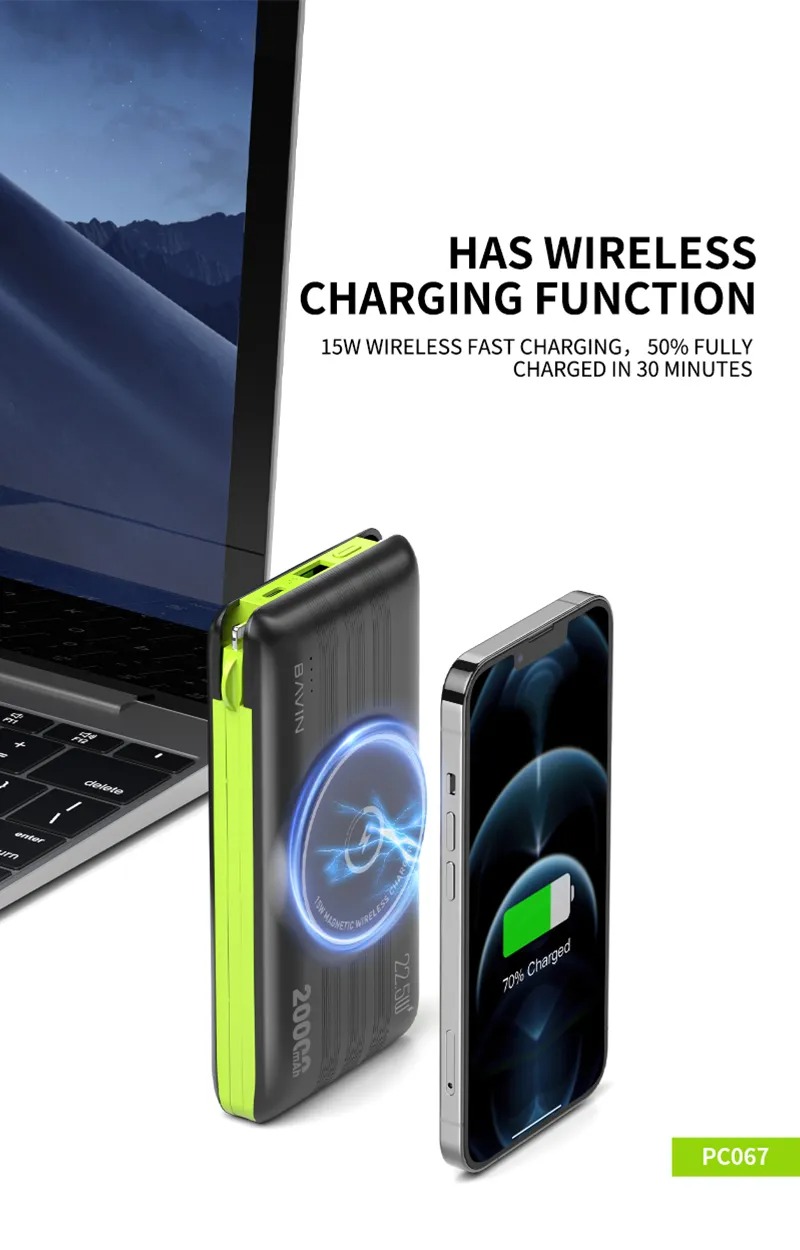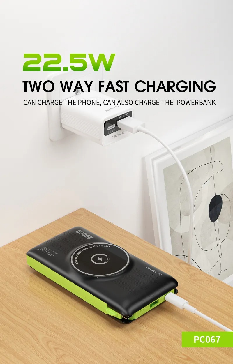 پاوربانک Bavin PC067 با قابلیت شارژ مگنتی مناسب گوشی های آیفون 12 و جدیدتر است و به صورت مگنتی به آنها میچسبد و وایرلس شارژ می کند. حداکثر توان خروجی شارژ وایرلس 15 وات و حداکثر توان کلی آن 22.5 وات است. داشتن نشانگر LED برای نمایش میزان شارژ باتری و کابل های متصل تایپ سی، میکرو و لایتنینگ (آیفونی) کامل کننده ویژگی های این پاوربانک است.