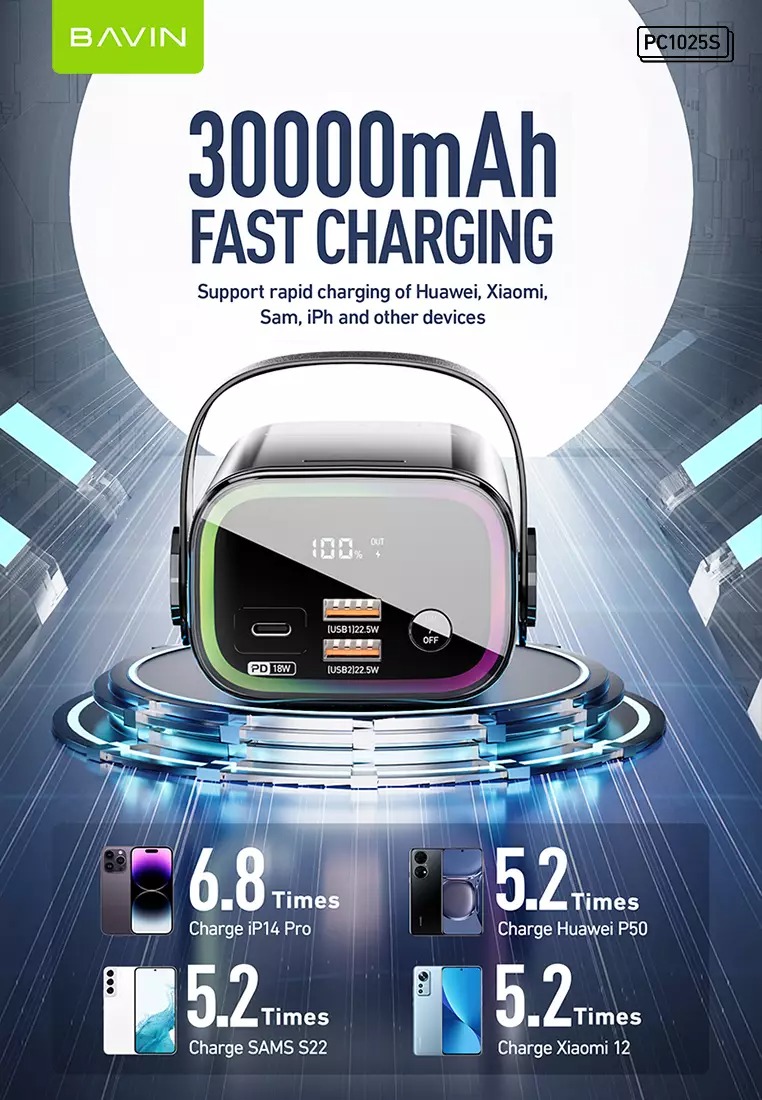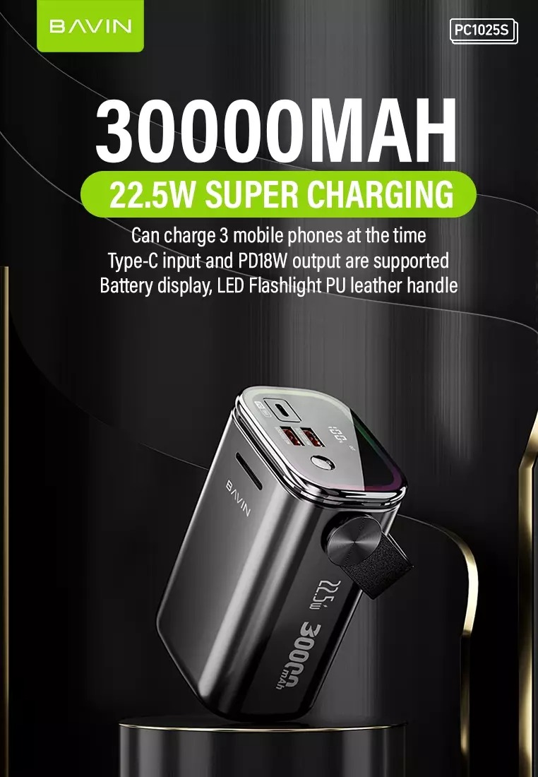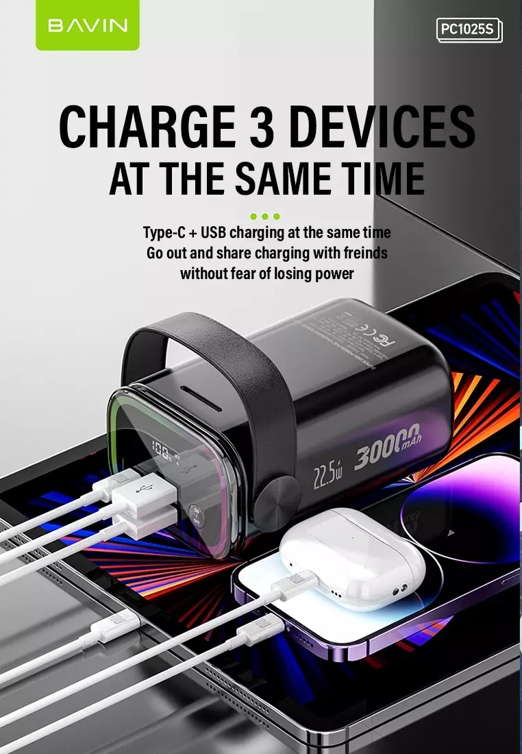 پاوربانک این روزها از ضروری ترین وسایل همراه ما به حساب می آیند. پاوربانک 30000 باوین Bavin PC1025S Power Bank توان 22.5 وات علاوه بر پاوربانک بودن دارای چراغ قوه برای روشنایی بوده که باعث شده شما بتوانید با استفاده از این محصول و بدون دغدغه به سفر و کمپ رفته و از آن استفاده کنید. پاوربانک باوین PC1025S با داشتن 3 پورت خروجی، توان 22.5 وات و ظرفیت اسمی 30000 میلی آمپر ساعت می تواند همراه خوبی برای شما باشد.