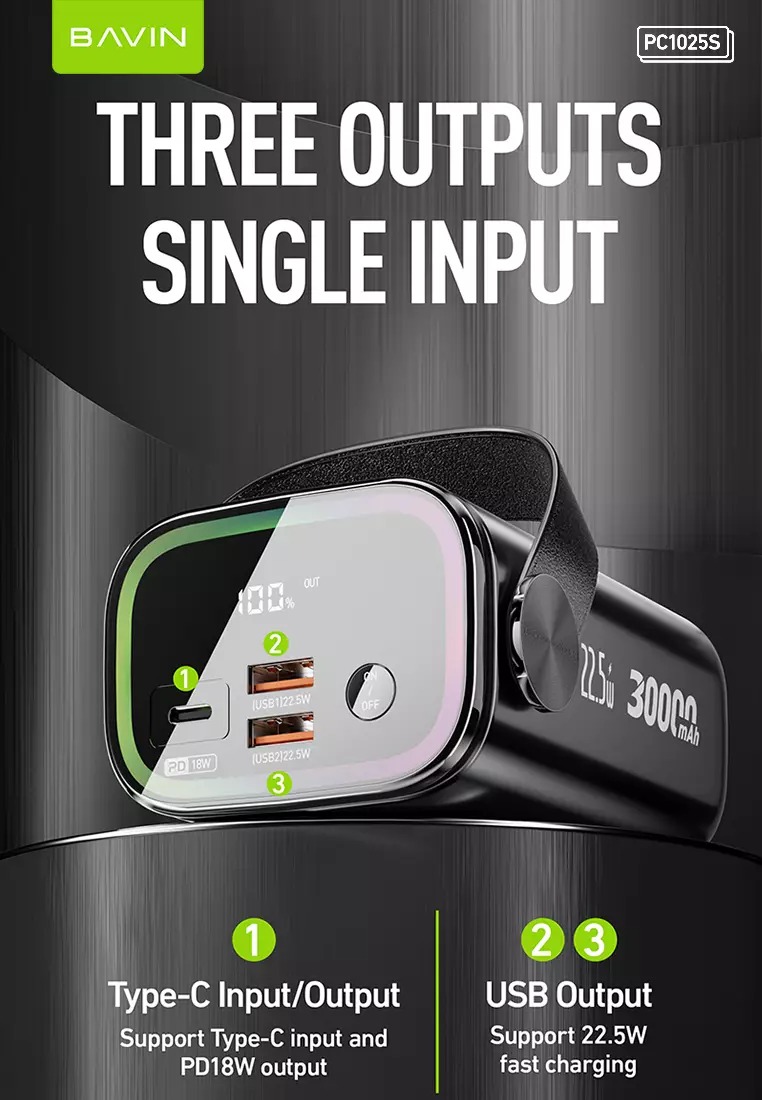 پاوربانک باوین PC1025S دارای 3 پورت خروجی کلی بوده که از این پورت ها، 2 پورت USB بوده و 1 پورت تایپ سی است. بعلاه پاوربانک PC1025S باوین دارای 1 درگاه ورودی (تایپ سی) است که می توانید به راحتی این دستگاه را به شارژ متصل کنید. قابل ذکر است درگاه‌ تایپ سی پاوربانک Bavin PC1025S به صورت ورودی/خروجی عمل می کند.