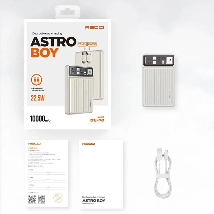 پاوربانک رسی مدل RPB-P40 دارای ظرفیتی بالغ بر 10000 میلی آمپر ساعت است که دارای دو عدد کابل متصل به بدنه با تایپ LIGHTNING و TYPE-C است که نیازی به حمل کابل همراه پاوربانک نخواهید داشت . علاوه بر کابل های متصل به بدنه پاوربانک یک عدد خروجی USB نیز به صورت جداگانه در نظر گرفته شده است . درگاه TYPE-C فقط به عنوان ورودی مورد استفاده قرار میگیرد که پاوربانک را شارژ میکند . کابل متصل به بدنه TYPE-C میتواند دستگاه شما را با توان 22.5W و کابل LIGHTNING نیز با توان 20W شارژ کند وزن سبک این پاوربانک باعث میشود در هنگام حمل و نقل آن با مشکلی رو به رو نباشید.