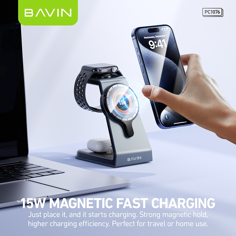 استند و شارژر وایرلس چندکاره باوین Bavin PC1076 3in1 توان 15 وات با قابلیت شارژ اپل واچ