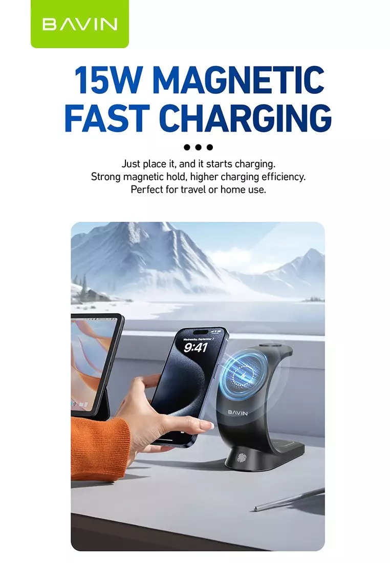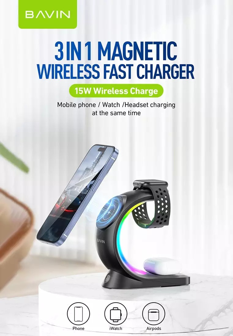 استند و شارژر وایرلس چندکاره مگنتی باوین Bavin PC1071 3in1 توان 15 وات با قابلیت شارژ اپل واچ