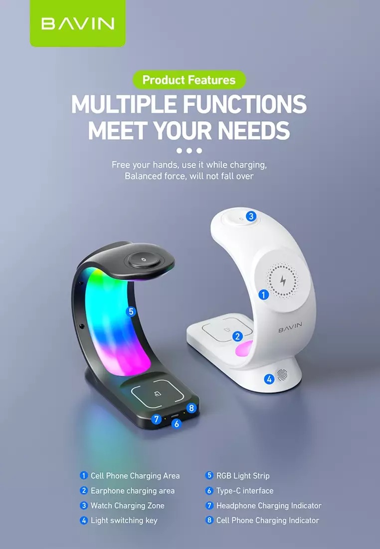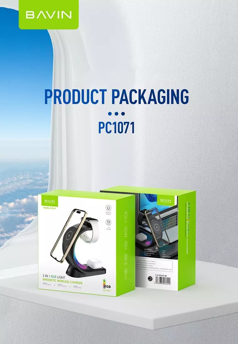 شارژهای وایرلس با توجه به راحتی در استفاده می توانند جایگزین مناسبی برای شارژهای دیواری باشند. باوین تصمیم گرفته تا با طراحی شارژر وایرلس Bavin PC1071 یک محصول چند منظوره ارائه کند که می‌تواند به عنوان شارژر وایرلس و استند استفاده شود. این استند شارژر دارای قابلیت شارژ تا 15 وات را دارا است و شما می‌توانید گوشی آیفون، اپل واچ و هندزفری بلوتوثی خود را روی آن شارژ کنید.