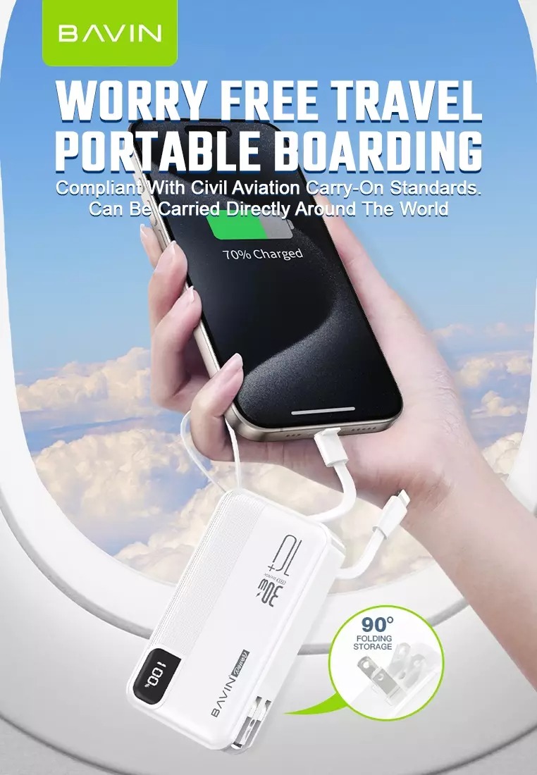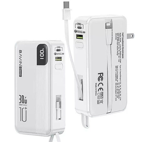 پاوربانک باوین PC018S دارای یک دوشاخه متصل است که به صورت 90 درجه روی آن قرار گرفته و قابل انعطاف و جمع شدن به داخل می باشد. یک صفخه نمایش نیز روی آن وجود دارد که میزان شارژ باقی مانده را نمایش می دهد.