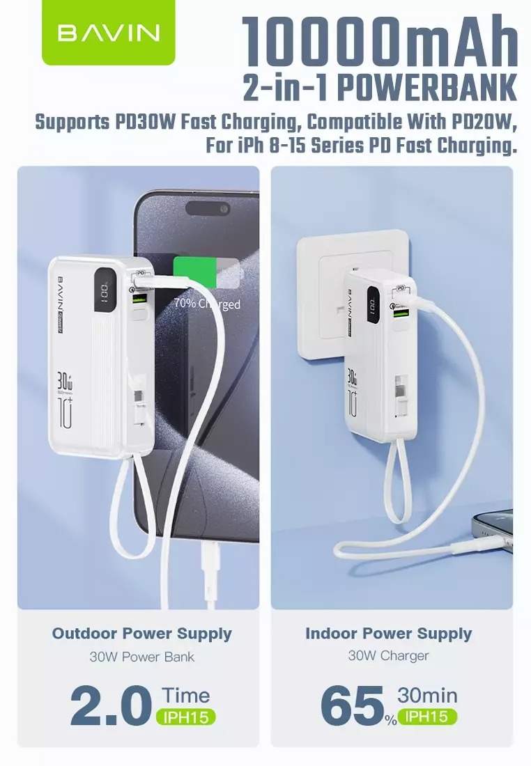 پاوربانک باوین PC018S یک کابل متصل تایپ C دارد که از آیفون 15 را نیز پشتیبانی می کند.یک کابل متصل IPH دیگر نیز در قسمت پشتی آن قرار دارد.همچنین یک خروجی USB-A نیز در کناره ی پاوربانک تعبیه شده است.کنار این خروجی یک پورت تایپ C وجود دارد که هم به عنوان خروجی و هم به عنوان ورودی استفاده می شود.