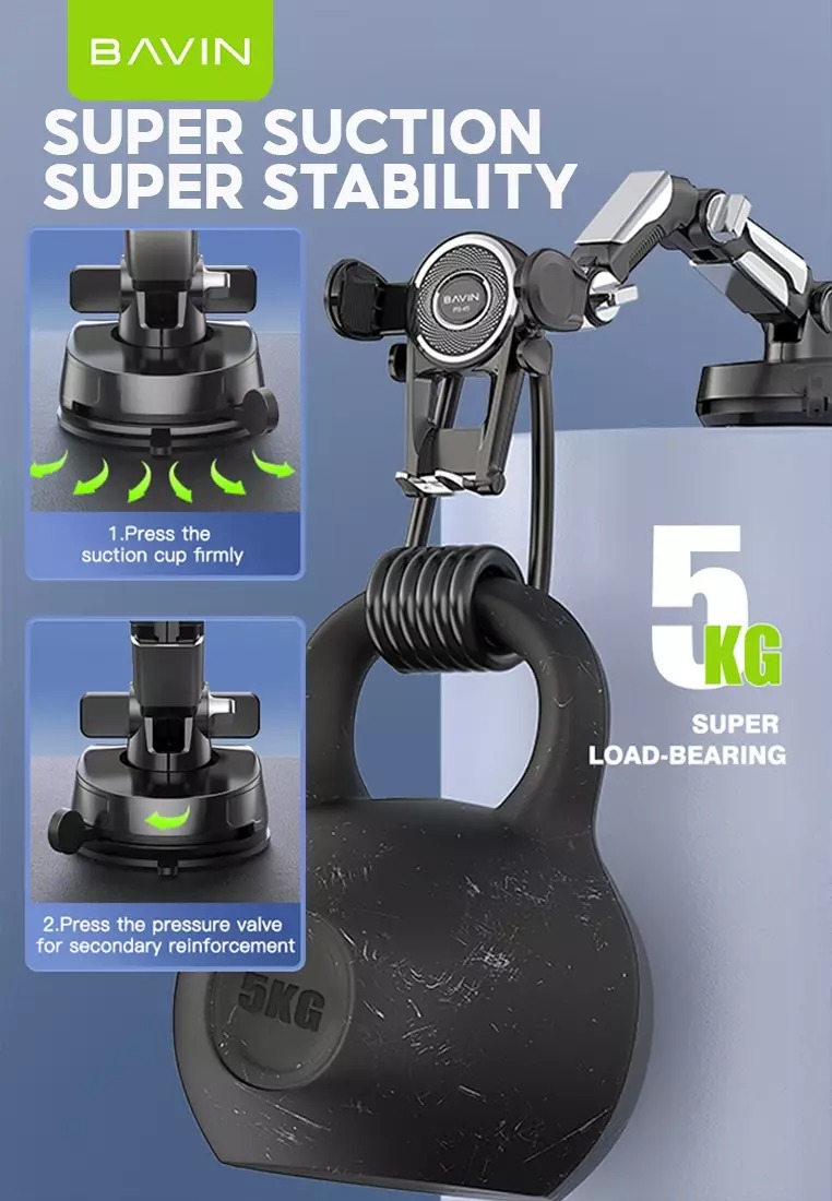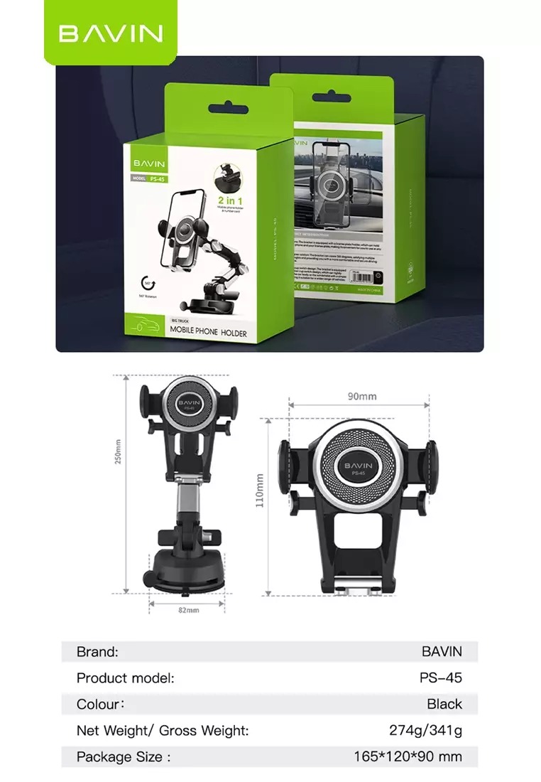 هولدر Bavin PS-45 به گونهای طراحی شده است که میتوانید آن را بر روی سطح داشبورد خودرو و یا شیشه جلوی ماشین بچسبانید. پایه این هولدربعد از نصب بسیار محکم و پایدار خواهد بود و دچار لغزش و سقوط نخواهد شد به طوری که تا 5 کیلوگرم را می تواند تحمل کند. این هولدر بعد از نصب، به خوبی گوشی را نگه داشته و شما می توانید به راحتی با گوشی خود کار کنید. بخش گیرنده هولدر داشبوردی Bavin PS-45 از نوع گیرهای بوده که میتوانید دکمه آن را کشیده و با یک دست گوشی خود را داخل هولدر قرار داده و یا از داخل آن بردارید. هولدر باوین PS-45 در ابعاد 165*120*90میلیمتر و با وزن 274 گرم و با پکیجینگ 341 گرم و با ر نگ مشکی ساخته شده است