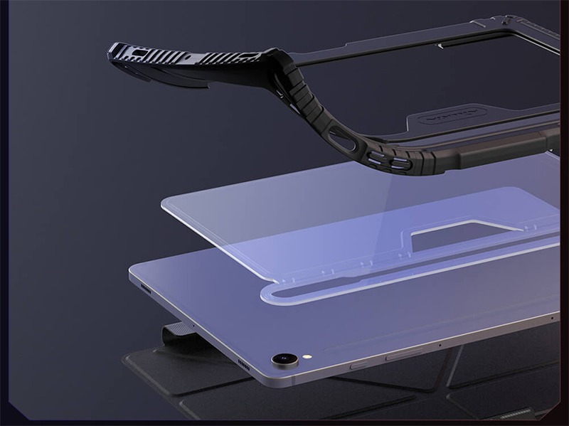 نیلکین که می توان به آن عنوان بزرگترین شرکت ساخت قاب و کیف های محافظ گوشی را داد، از تبلت ها هم غافل نمانده است. کیف چرمی هوشمند نیلکین تبلت Samsung Galaxy Tab S9 از موادی چون TPU، PC و PU ساخته شده و کاملا مطابق با ابعاد تبلت شما می‌باشد. این کیس در اطراف بدنه دارای بامپر است تا در صورت افتادن و ضربه دیدن هیچ آسیبی به لبه‌های تبلتپرو وارد نشود.