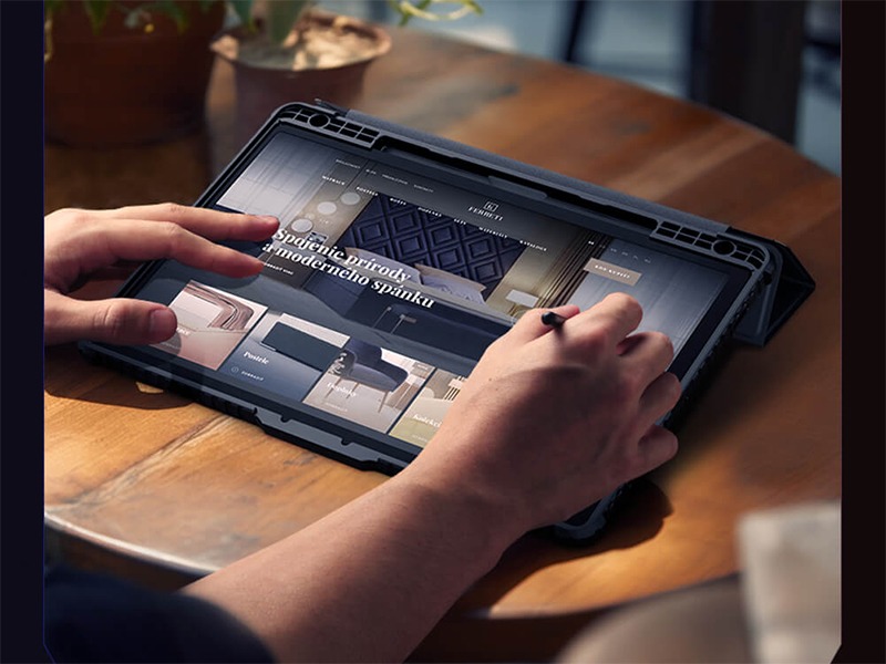 روکش رویی کیف از چرم PU است که بافت دار بوده و جلوی سر خوردن کاور را می‌گیرد. برای محافظت بیشتر یک لایه پنل PC هم در بدنه به کار رفته و اطراف آن با پوشش TPU تقویت شده است. ترکیب این دو، مانع از خش برداشتن تبلت و آسیب دیدن آن در صورت افتادن و ضربه دیدن می‌شود. اما در عین حال به دلیل طراحی شفافی که دارد تمام ظاهر تبلت را هم نمی‌پوشاند.