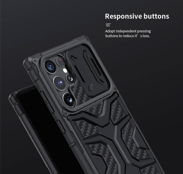 جدا از مقاومت بسیار بالا این قاب در بخش بالا دارای اسلاید کشوشی مخصوص محافظت از لنز های دوربین و حریم خصوصی می باشد که به راحتی میتوانید آن را باز و بسته کنید؛این قاب تمامی پشت و لبه های گوشی را پوشش می دهد،تمامی لبه های بالا پایین و اطراف این قاب Adventurer بسته بوده و بخش کلید ها گوشی هم به خوبی پوشش داده می شود، کلید های خود گارد بسار روان و راحت می باشد.