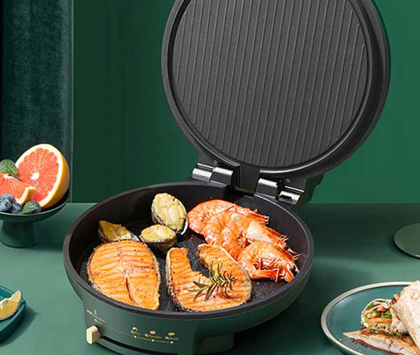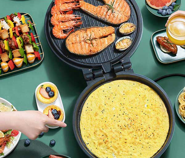 این محصول علاوه بر این که یک  تابه برقی است با توجه به سینی های داخلی اش امکان پخت انواع پنکیک و گریل خوراکی ها بدون روغن را نیز فراهم می کند و می توان گفت با خرید این محصول ۳ کالای کاربردی را در قالب یک کالا تهیه کرده اید . جنس این تابه از بدنه فلزی و پوشش نچسب میباشد و بدون روغن، غذا آماده خواهد شد.