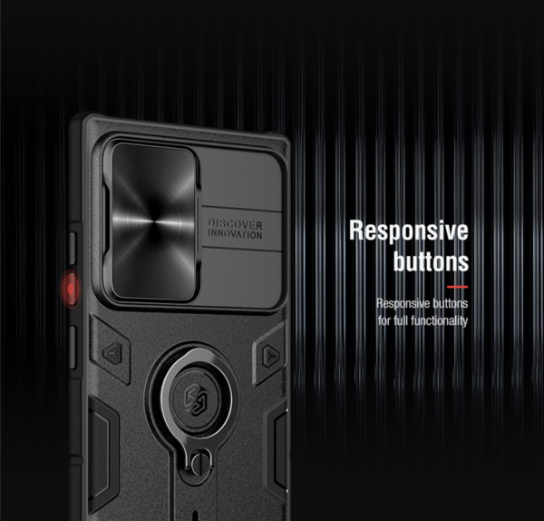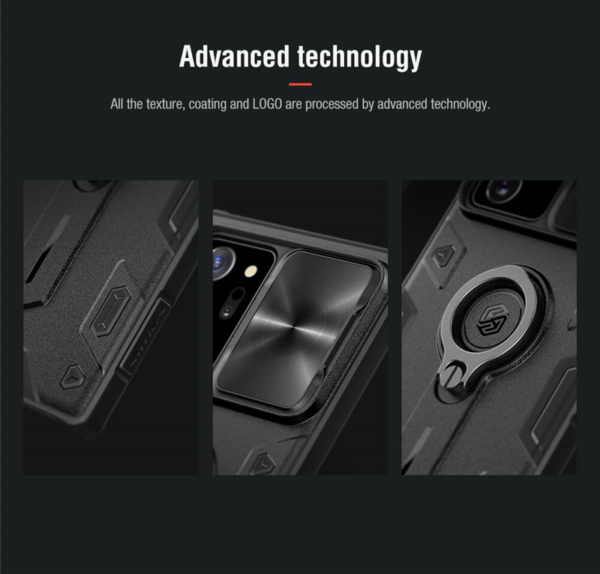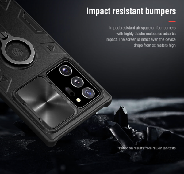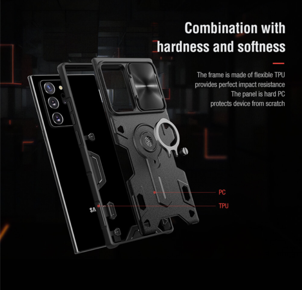 کاور محافظ نیلکین مدل CamShield Armor برای گوشی سامسونگ Galaxy Note 20 Ultra خیالتان را از بابت صدمه دیدن لنز دوربین و بدنه اسمارت فون راحت میکند.این کاور محافظ ظاهر بسیار متفاوت و جذابی داشته و گزینهای مناسب برای کاوری خاص و مقاوم است.جنس بدنه این کاور از پلیکربنات است که مقاومت بسیار بالایی در برابر ضربه و خط وخش دارد و در لبههای کاور از TPU یا پلاستیک منعطف استفاده شده است تا از ضربه به گوشی تا حد بالایی جلوگیری کند. همچنین یک حلقهی استند در پشت کاور وجود دارد که میتوانید از آن برای تماس تصویری و تماشای فیلم استفاده کنید.
