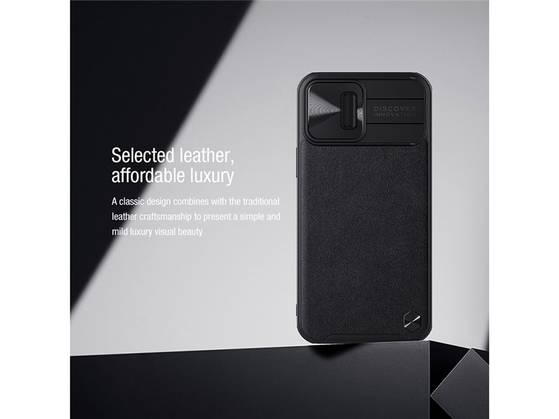کیف چرمی CamShield که نوعی زیبایی بصری ساده و مجلل را ارائه می دهد، قطعا یک طراحی کلاسیک است. این پوسته ترکیبی از سخت و نرم را با اتصال لبه‌های TPU و صفحه پشتی رایانه شخصی برای جلوگیری از افتادن و خراشیدگی به کار می‌گیرد، و لایه‌ای از چرم بافت‌دار که صفحه پشتی رایانه شخصی را می‌پوشاند دارای یک لمس ظریف و ابریشمی، ضد اثر انگشت و جلوگیری از آلودگی روغن است. پوشش کشویی لنز ثبت شده نه تنها از خراشیدن لنز جلوگیری می کند، بلکه از حریم خصوصی تلفن شما در برابر افشای آن محافظت می کند. همچنین نوارهای ضد لغزش با شکستگی براق براق لیزری در دو طرف اضافه شده است تا عملکرد ضد سقوط را ارتقا دهد.متریال ترکیبی از سخت و نرم حاشیه‌های نرم TPU و قاب پشتی سخت و با ترکیب چرم ظریف، تلفن همراه شمارا در برابر ضربدیدگی و خط و خش محافظت می‌کند.