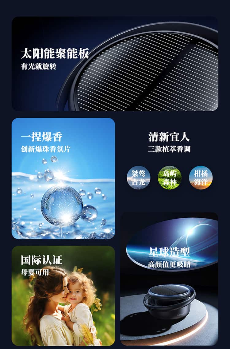 بدون نیاز به برق با عملکرد خورشیدی دارای سه رایحه درمانی گیاهی دارای فن چرخشی برای پرااکنده کردن رایحه رایحه اقیانوس مرکبات – رایحه جنگل وحشی جنس بدنه PC+PCTG ابعاد 88×88×43 میلی متر