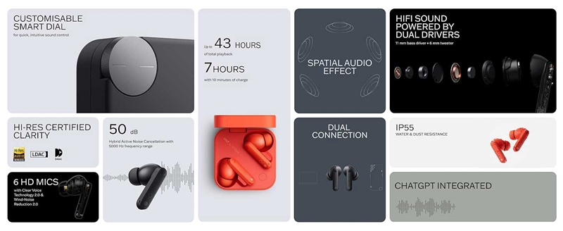 سایر ویژگی هاحذف نویز فعال هیبریدی (ANC) پیشرفته: کاهش نویز تا 50 دسی‌بل محدوده فرکانسی تا 5000 هرتز وضوح صدای Hi-Res: فناوری LDAC با سرعت انتقال تا 990 کیلوبیت در ثانیه کیفیت صدای بی‌نظیر و با جزئیات بالا فناوری باس پیشرفته 2.0: شناسایی و تقویت فرکانس‌های پایین در زمان واقعی پنج سطح تنظیم باس در اپلیکیشن Nothing X حذف نویز فعال هوشمند: تشخیص و جبران نشت نویز بین ایرباد و کانال گوش حالت Adaptive برای حذف نویز سازگار با محیط عمر باتری طولانی: 10 ساعت پخش موسیقی با یک بار شارژ 43 ساعت پخش موسیقی با استفاده از کیس شارژ طراحی سبک و راحت: وزن ایرباد: 4.9 گرم کیس شارژ: 46 گرم مقاوم در برابر آب و گرد و غبار: استاندارد IP55 اتصال سریع و پایدار: بلوتوث 5.3 پشتیبانی از Google Fast Pair و Microsoft Swift Pair کنترل‌های قابل تنظیم: کنترل‌های موسیقی، تماس‌ها و فعال‌سازی دستیار صوتی قابل تنظیم از طریق اپلیکیشن Nothing X سازگاری با سیستم‌های مختلف: اندروید 5.1 و بالاتر iOS 13 و بالاتر شارژ سریع: 10 دقیقه شارژ برای 3 ساعت پخش موسیقی (با ANC خاموش) 10 دقیقه شارژ برای 1.8 ساعت پخش موسیقی (با ANC روشن) پشتیبانی از کدک‌های صوتی متنوع: AAC، SBC، LDAC میکروفون‌های با کیفیت بالا: هر ایرباد دارای 3 میکروفون Clear Voice Technology 2.0 برای تماس‌های واضح