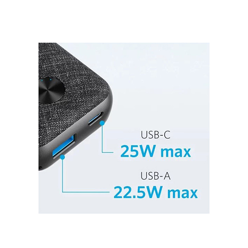 نکته قابل توجه در مورد طراحی این کالا علاوه بر کوچک بودن آن جنس روی آن است که از پارچه بوده و سبب شده تا این شارژر همراه انکر ظاهری زیبا داشته باشد. پاوربانک انکر علاوه بر داشتن دو درگاه خروجی برای شارژ محصولات مختلف از فناوری شارژ سریع PD نیز بهره مند می باشد. لازم به ذکر است که می توان از درگاه USB-C این پاوربانک برای شارژ آن استفاده کرد و شدت جریان و ولتاژ ورودی مناسب آن 5V/3A , 9V/2A می باشد. شدت جریان و ولتاژ خروجی نیز به این صورت است: