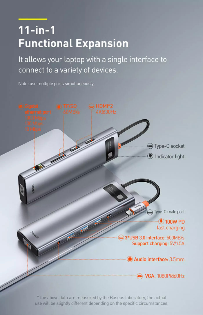 گاهی اوقات نیاز به درگاهی داریم که روی لپ تاپ، PC یا... وجود ندارد و یا حتی اگر هم وجود دارد با وسیلههای دیگری اشغال شده است. از طرفی با وجود باریکتر شدن لپتاپها (که سیر آن همینطور ادامه دارد) هم شاهد کم شدن پورتهای روی بدنه هستیم که ما را با مشکل شدید کمبود پورت مواجه کرده است. هاب 11 پورت Baseus Metal Gleam Series 11-in-1 Multifunctional HUB محصولی از کمپانی بیسوس است که در مجموع 11 پورت متفاوت و پرکاربرد را در اختیار شما میگذارد. با این هاب و با در اختیار داشتن درگاههای مختلف میتوانید دستگاههای بیشتری را به سیستمتان متصل کنید و محدودیتی نداشته باشید.